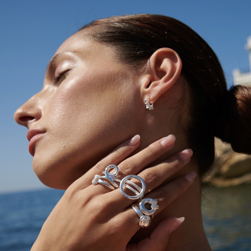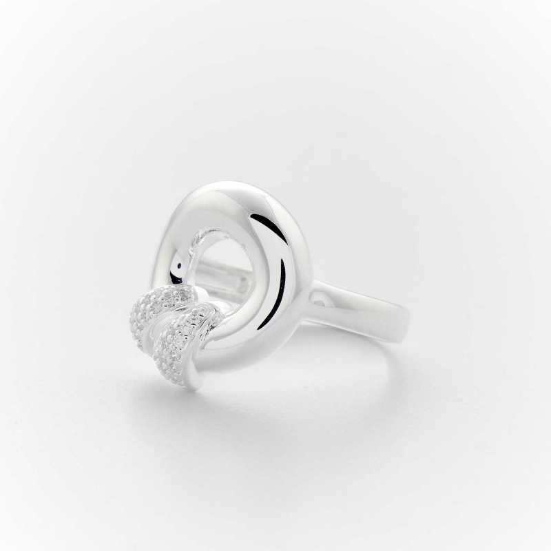 Bague argent formée d'un petit cercle dodu décoré de 2 petits anneaux dodus de formes différentes et pavés d'oxydes
