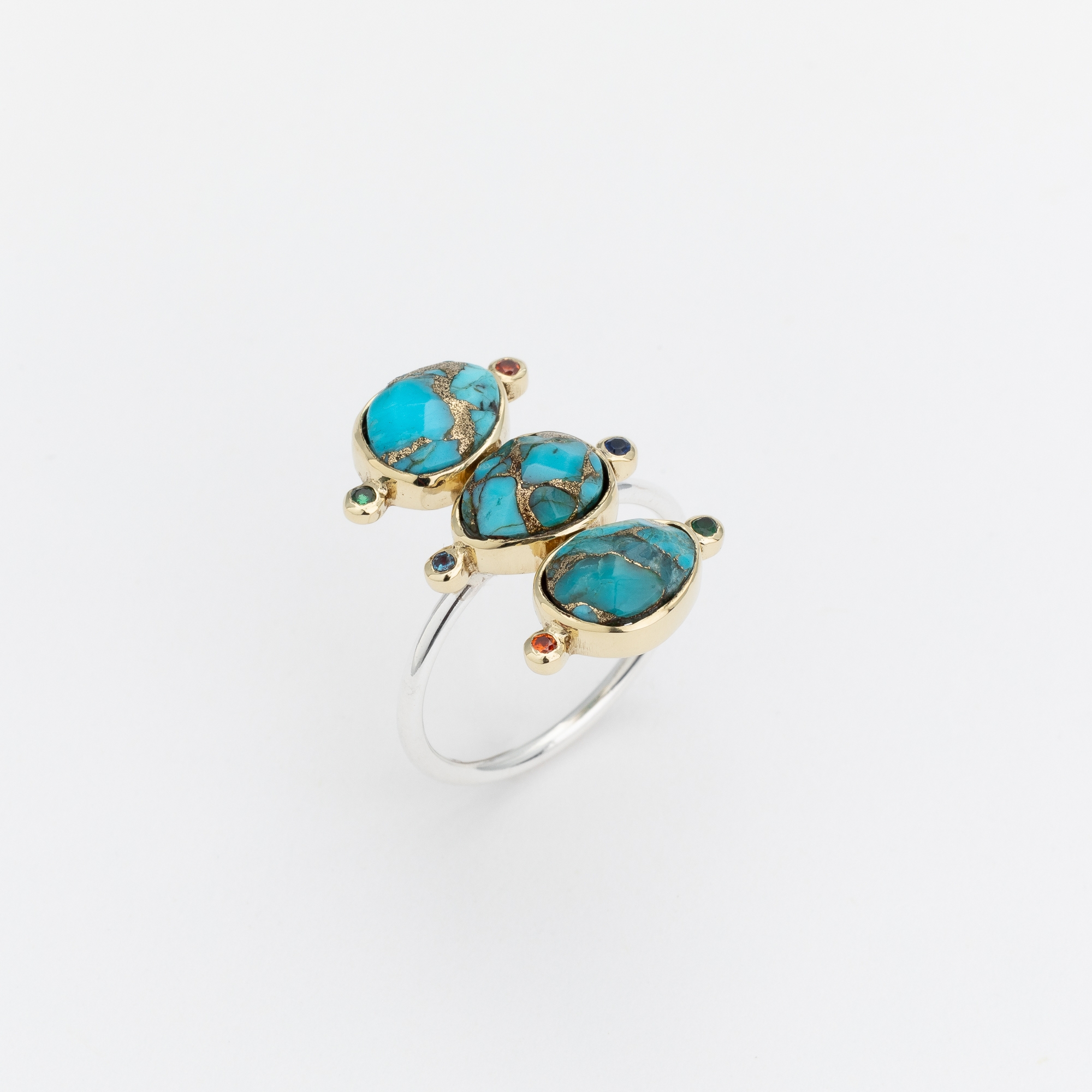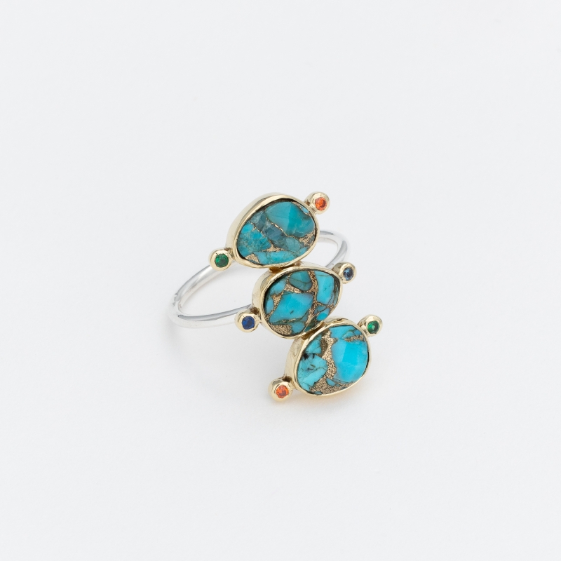 Bague bicolore formée de 3 petits ovales de copper turquoise sertis de laiton et décorés de 6 mini oxydes multicolores sur un fin anneau argent