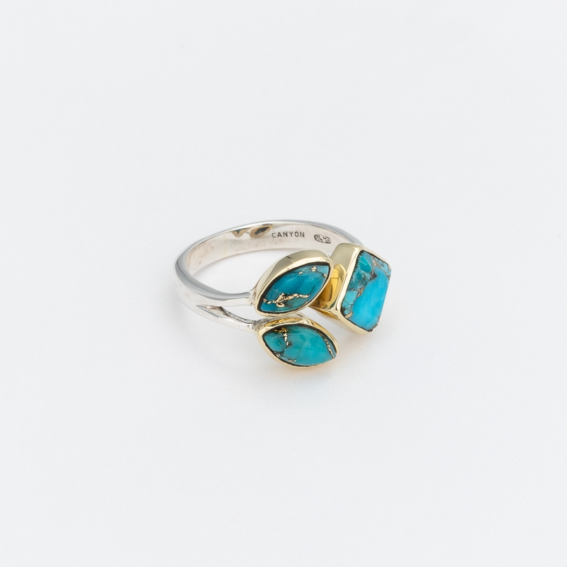 Bague bicolore décorée de 3 copper turquoises en forme de carré et de marquise serties de laiton sur un anneau argent