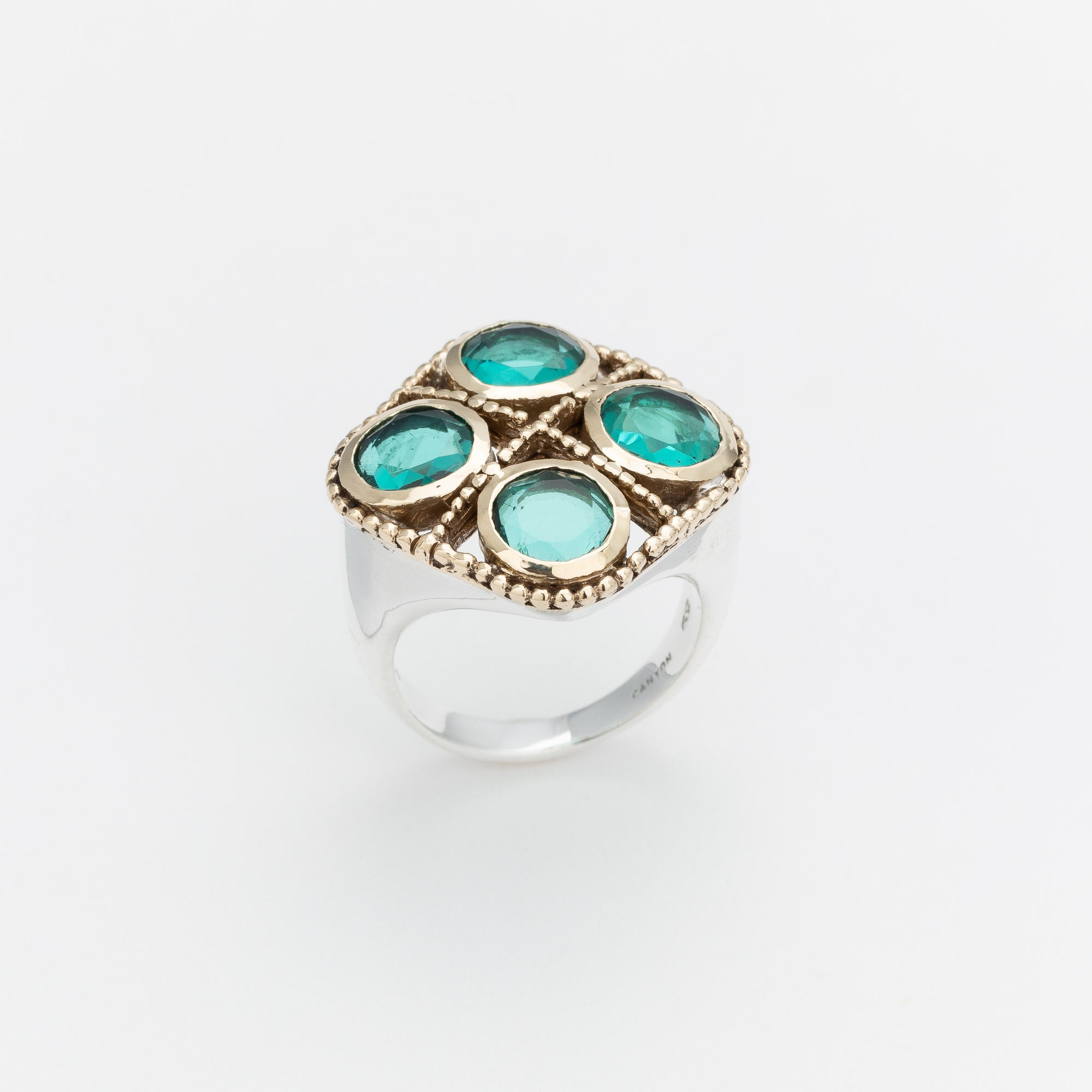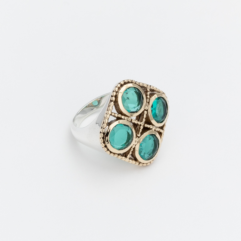 Bague en argent carré décorée de 4 verres couleur apatite rondes serties de laiton sur un anneau argent