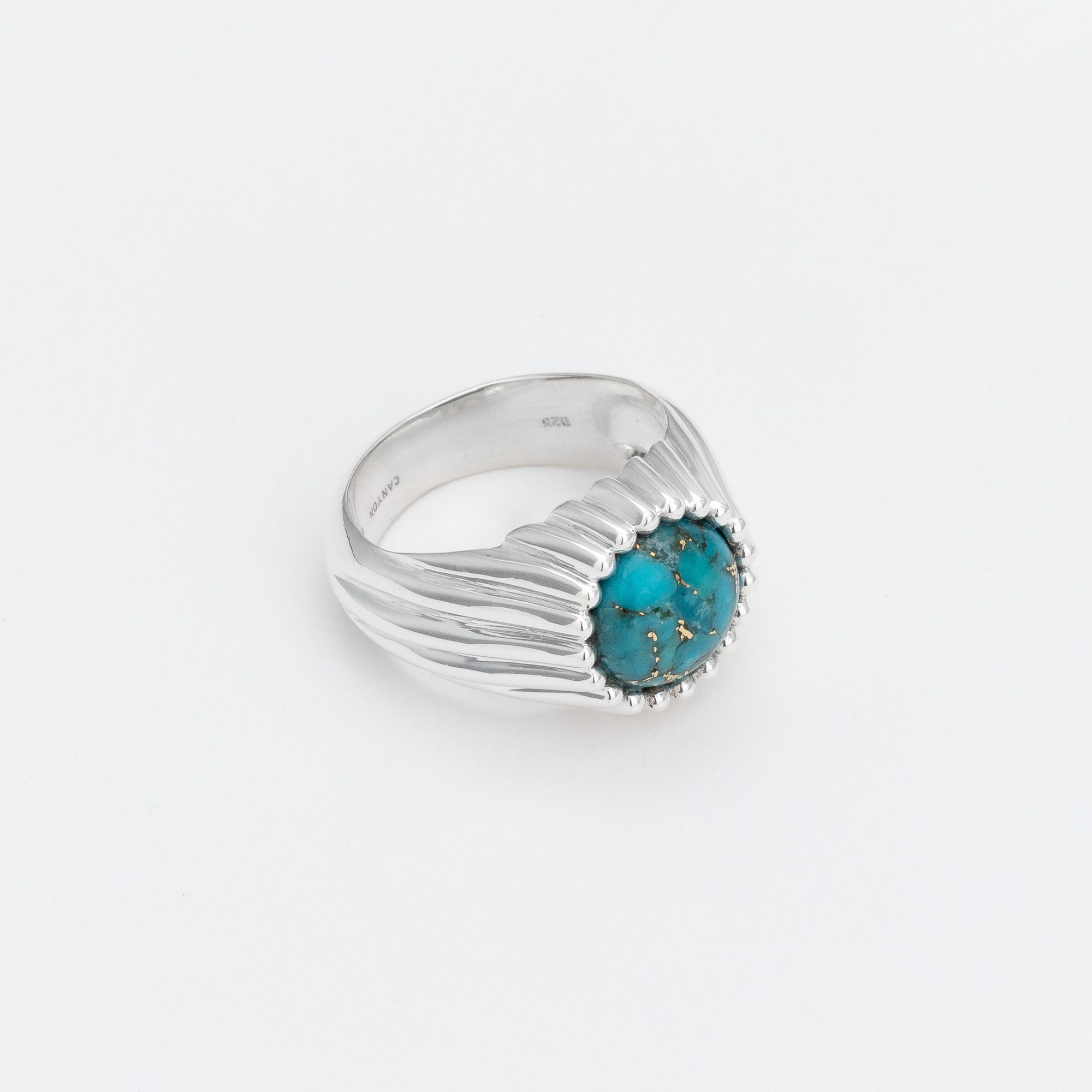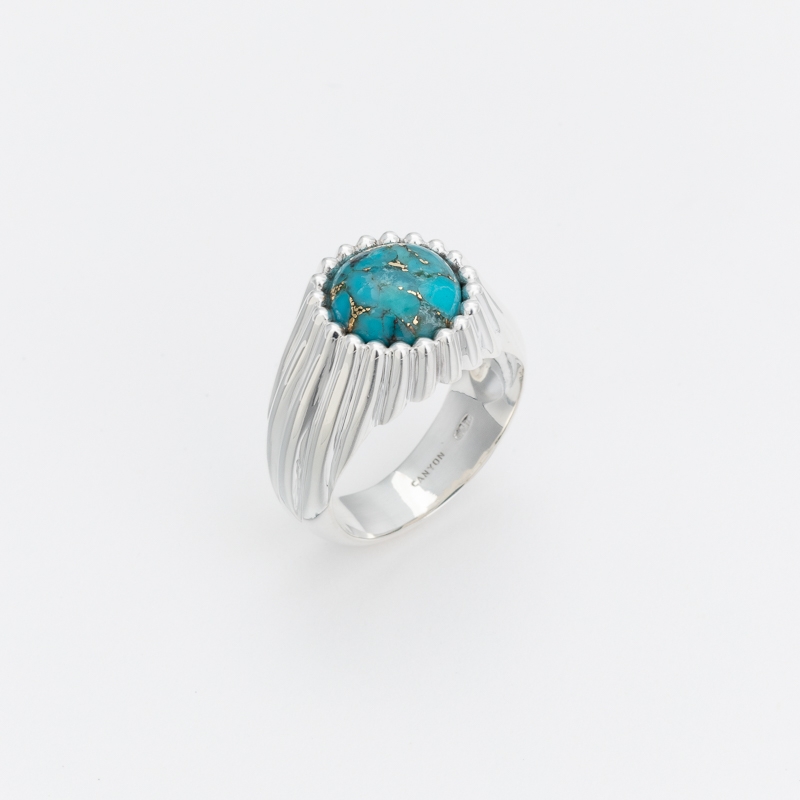 Bague en argent composée d'un petit rond de copper turquoise serti de fin godrons se terminant par de micro boules