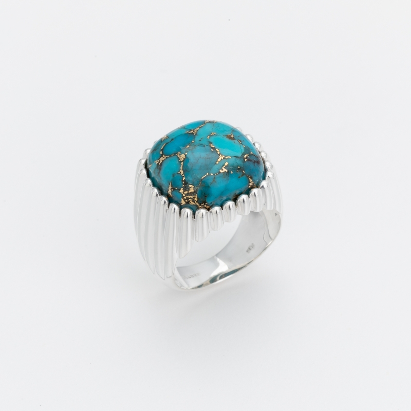 Bague en argent composée d'un grand carré de copper turquoise serti de fin godrons se terminant par de micro boules