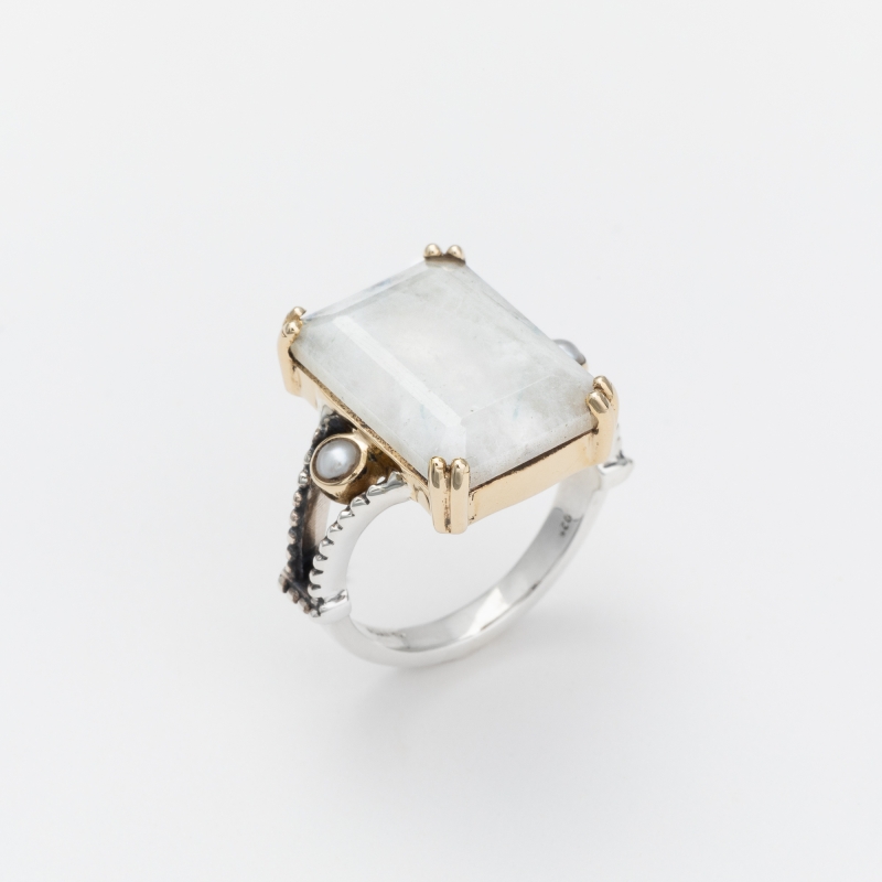 Bague argent et laiton composée d'un anneau argent et d'une pierre de lune rectangle serti de laiton comme les deux petites perles blanches de chaque côté