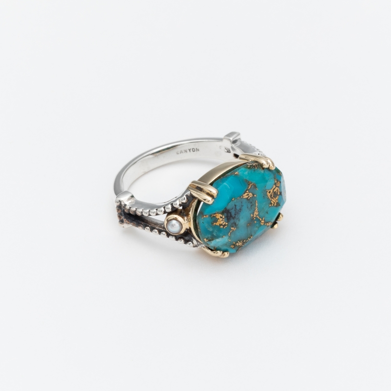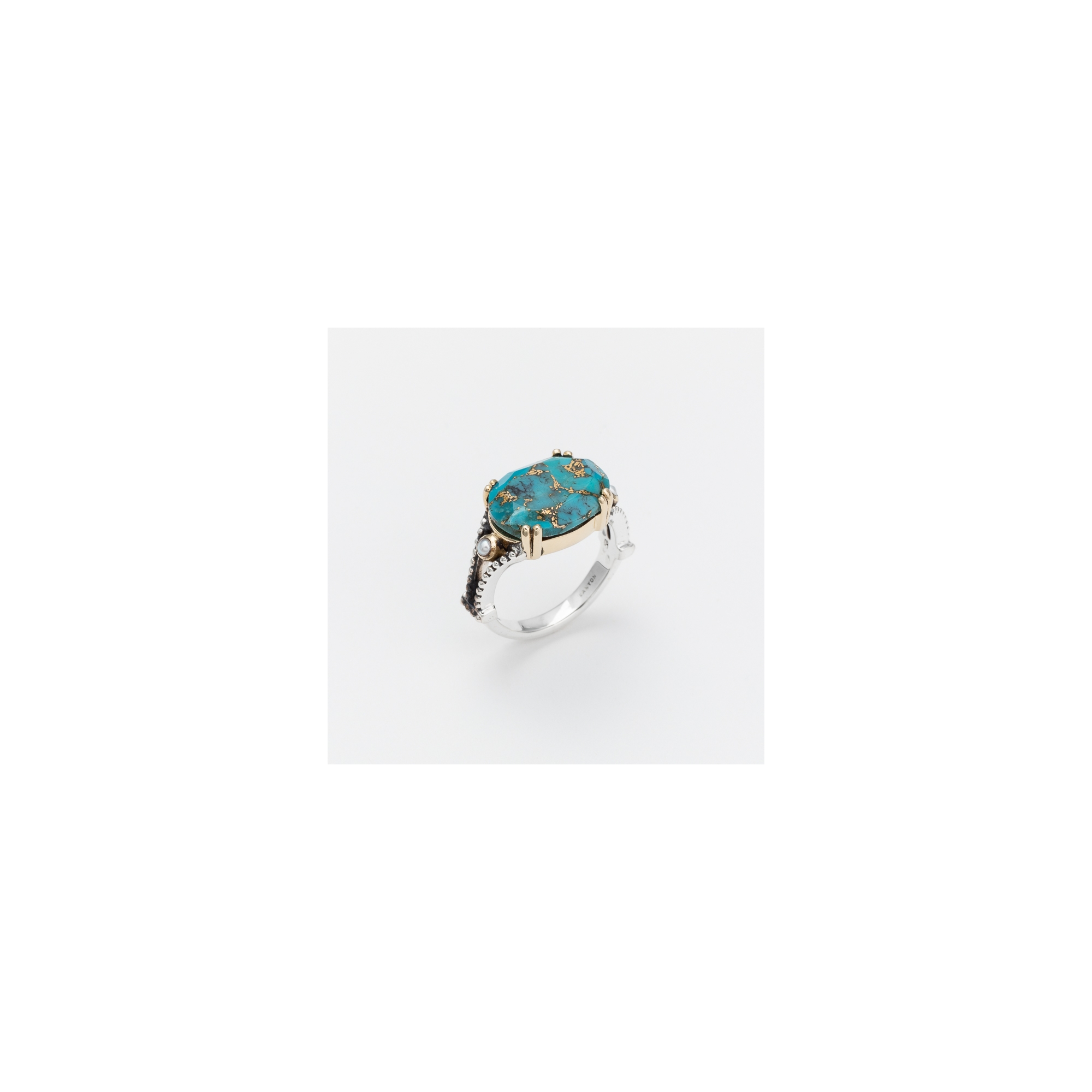 Bague argent et laiton composée d'un anneau argent et d'une copper turquoise sertie de laiton comme les deux petites perles blanches synthétiques de chaque côté