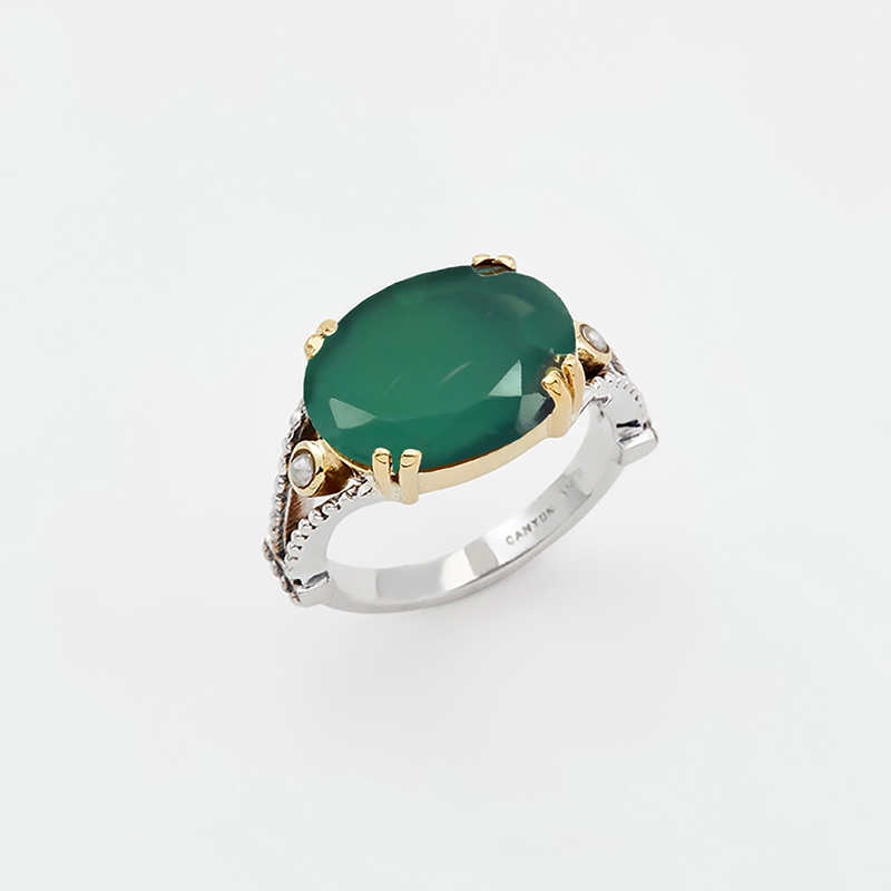 Bague argent et laiton composée d'un anneau argent et d'un onyx vert ovale serti de laiton comme les deux petites perles blanches synthétiques de chaque côté