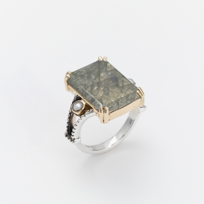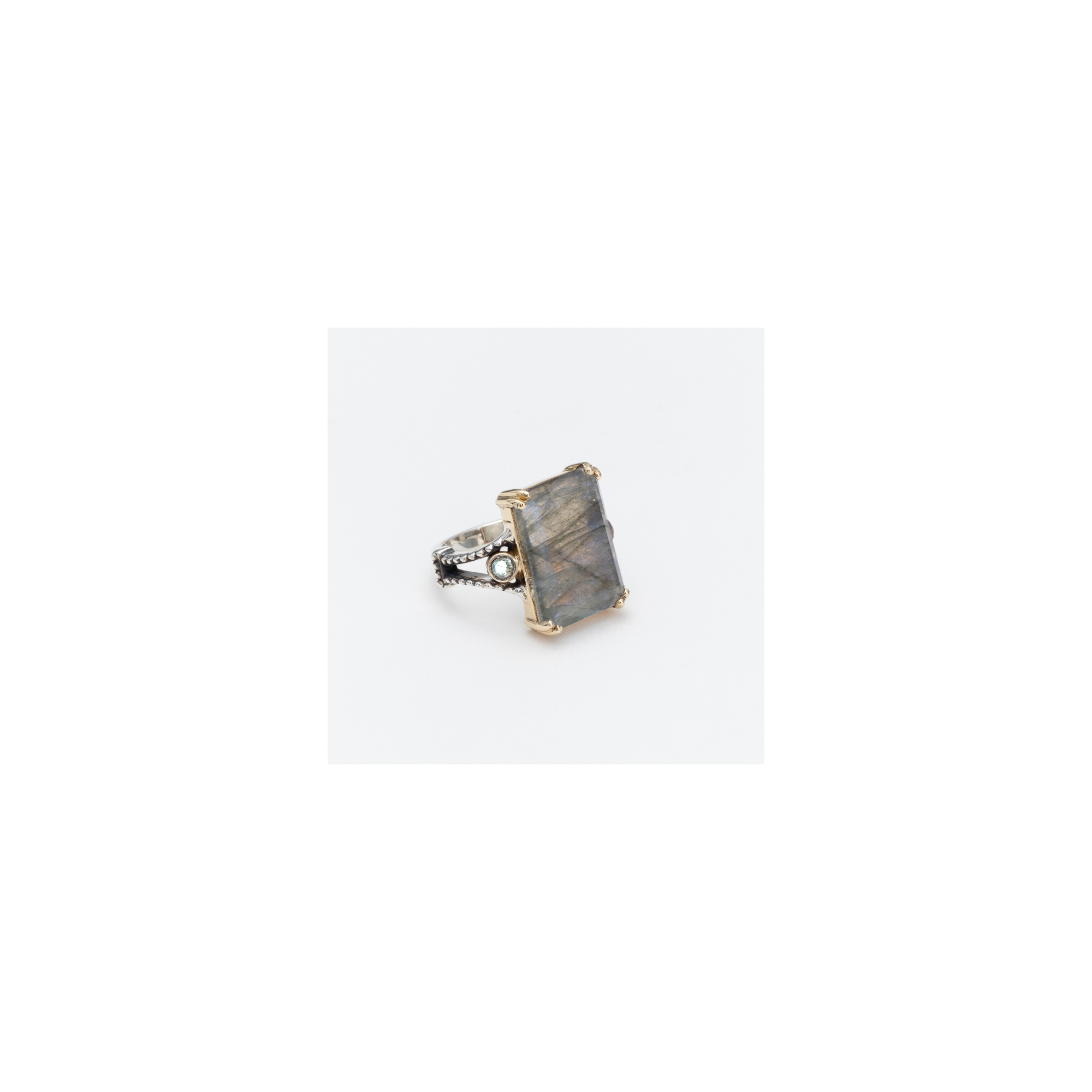 Bague argent et laiton composée d'un anneau argent et d'une labradorite rectangle sertie de laiton comme les deux petites labradorites de chaque côté