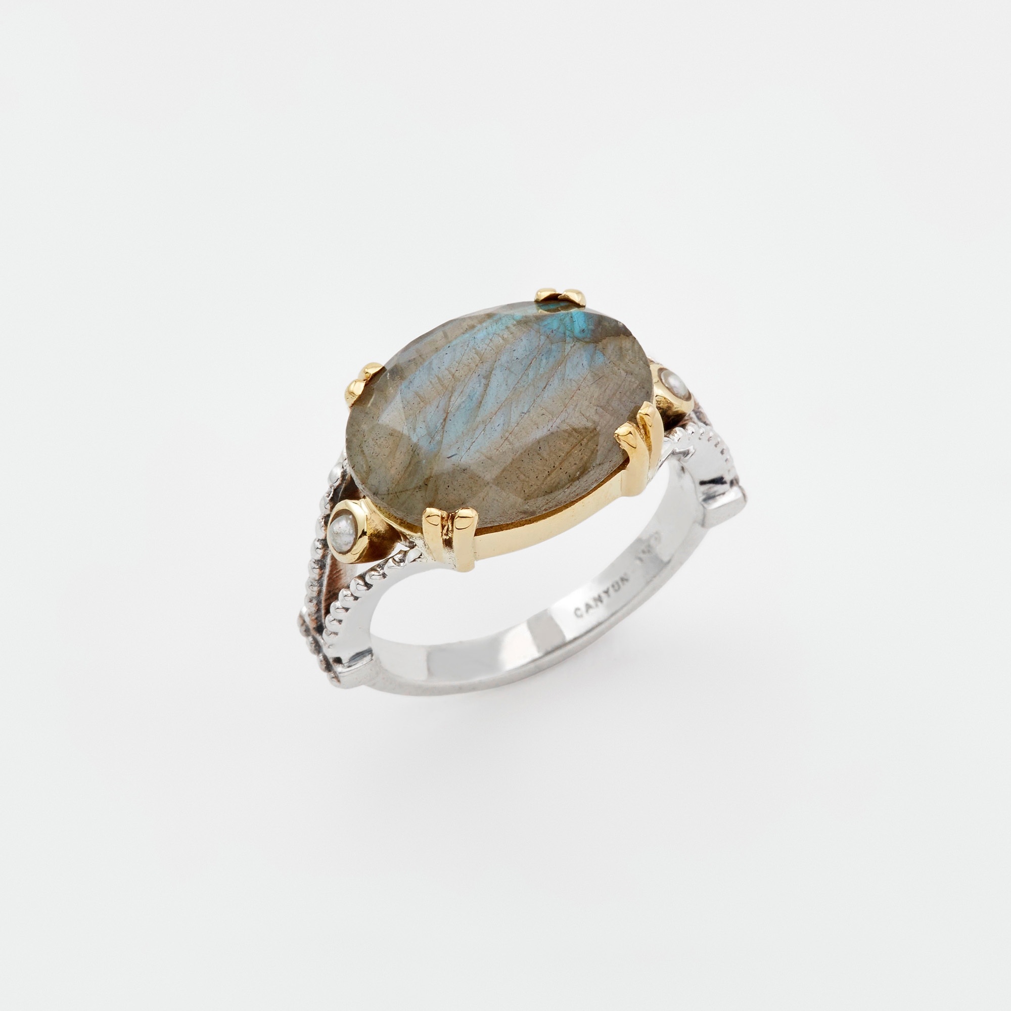 Bague argent et laiton composée d'un anneau argent et d'une labradorite ovale sertie de laiton comme les deux petites perles blanches synthétiques de chaque côté