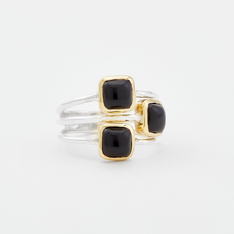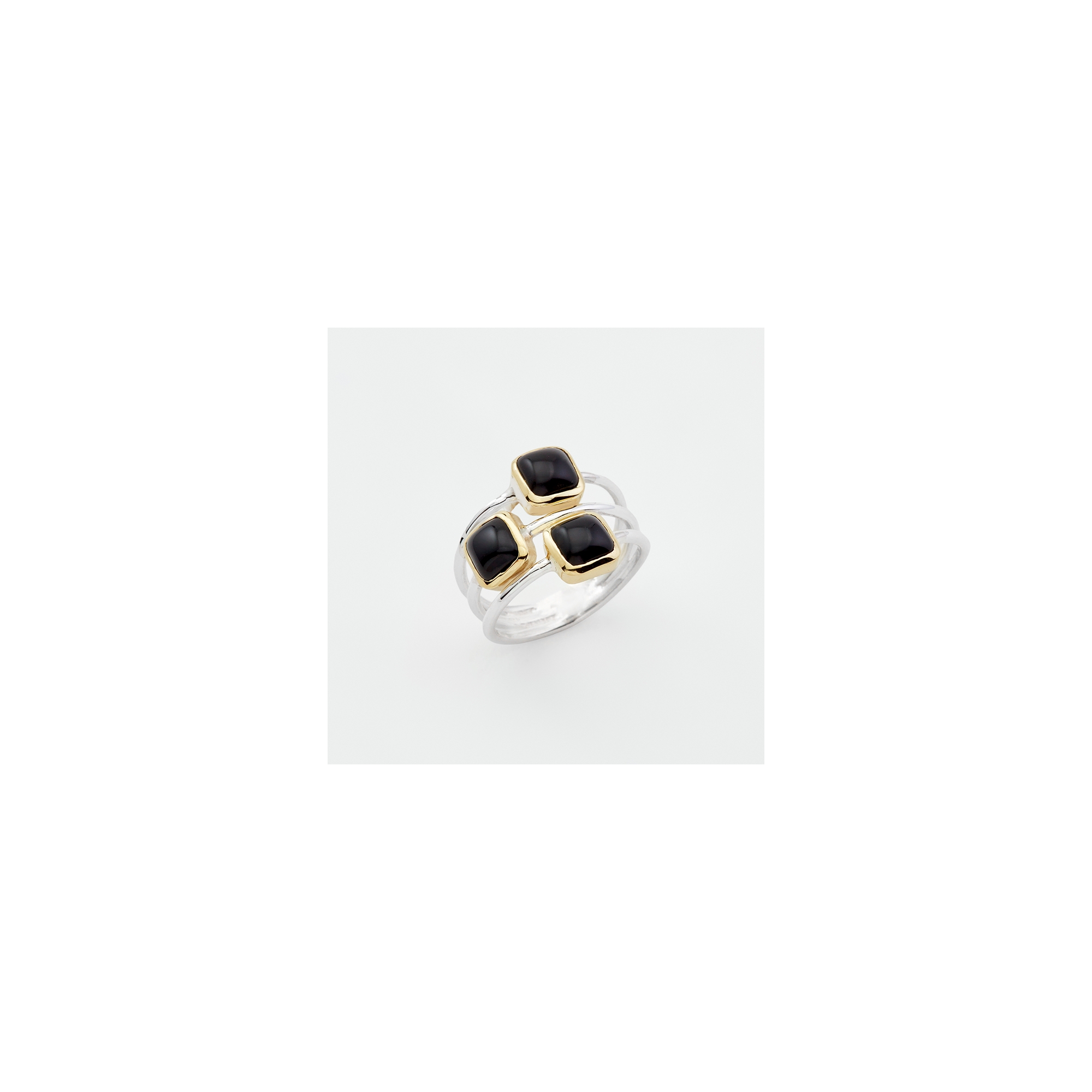 Bague en argent et laiton décorée de 3 carrés d'onyx noir chacun sur un anneau et légèrement décalés