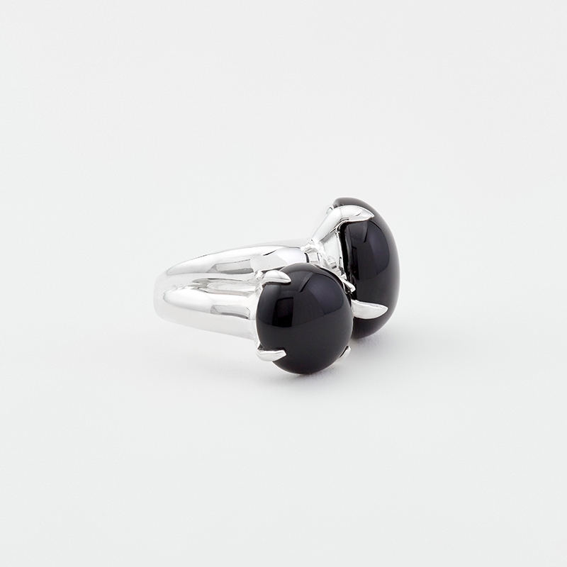 Bague en argent composée de 2 cabochons d'onyx noir sertis de longues griffes fines
