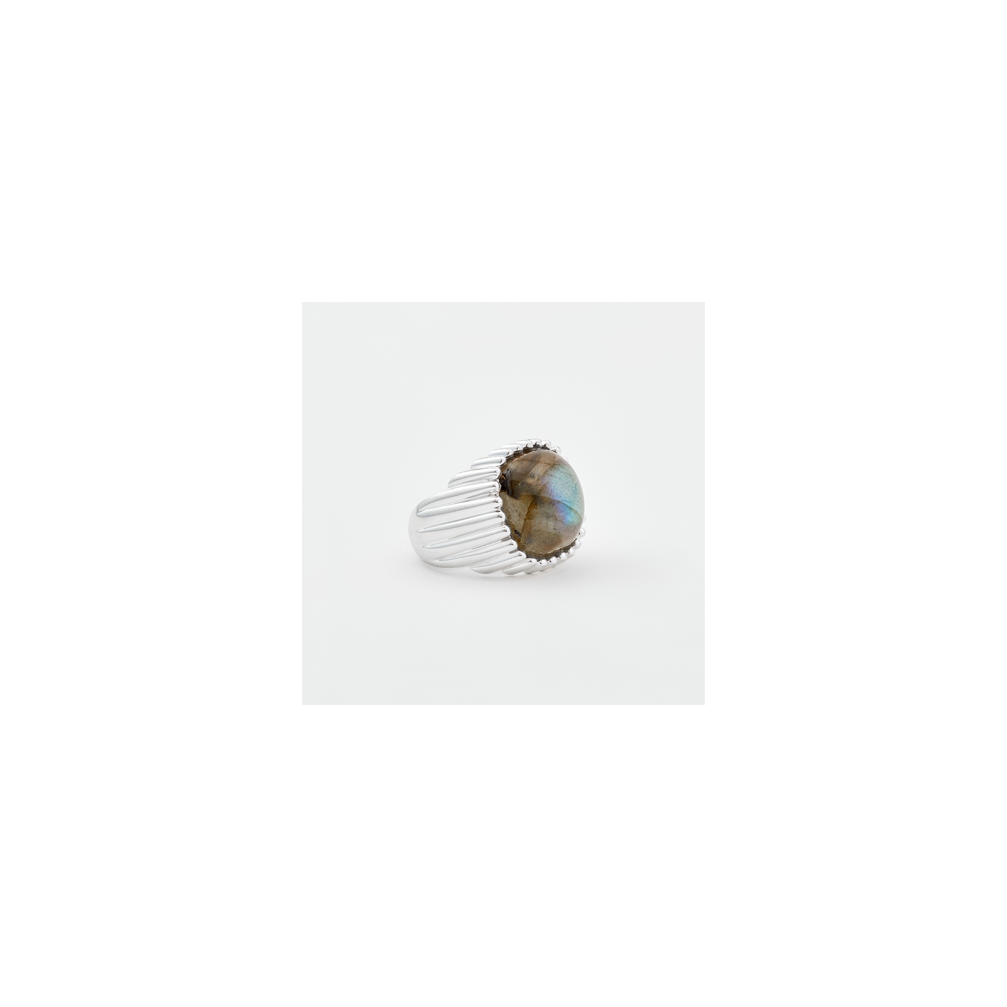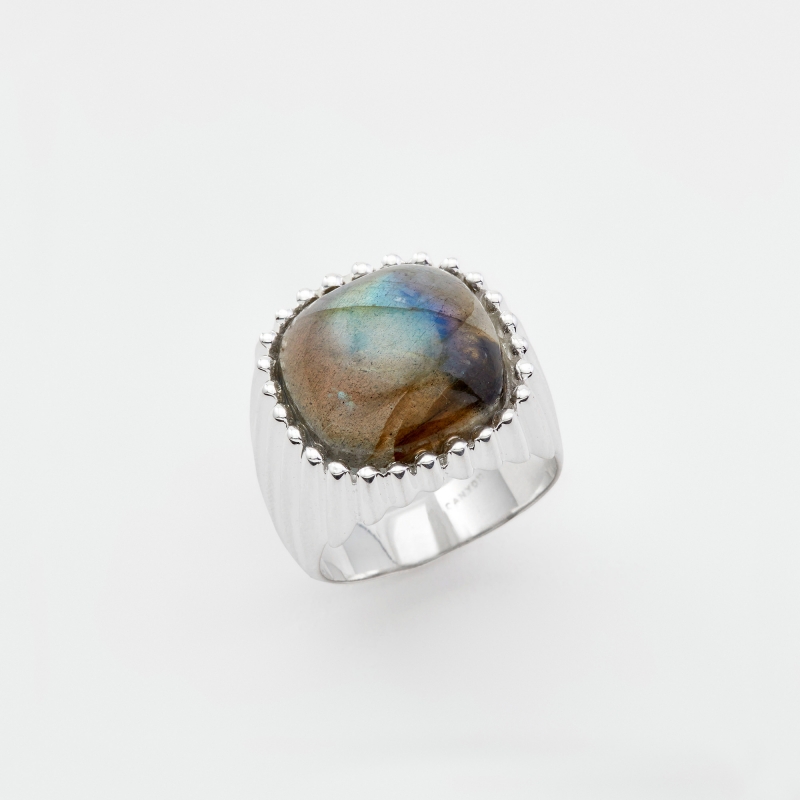 Bague en argent composée d'un grand carré de labradorite serti de fin godrons se terminant par de micro boules