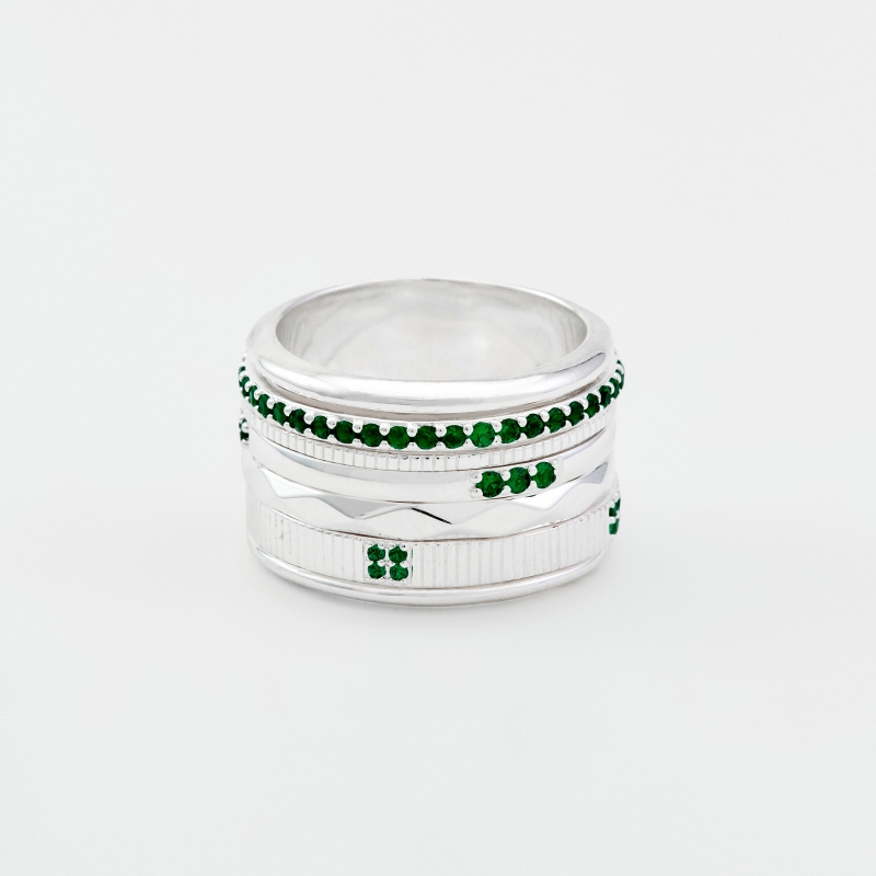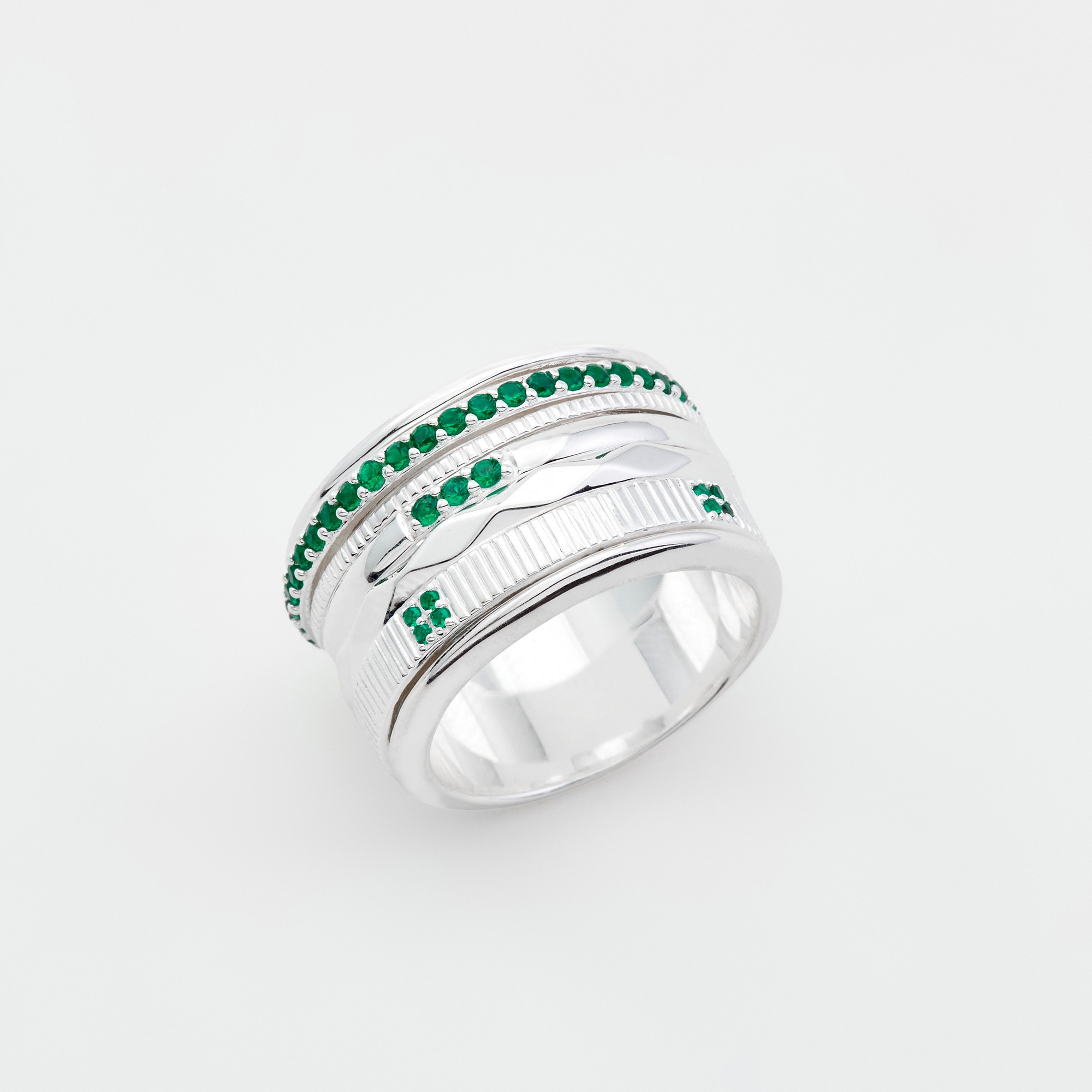 Bague en argent dite de prière composée d'un large anneau fixe et de 5 anneaux mouvants différemment travaillés et pour certains décorés d'émeraude verte de synthèse.