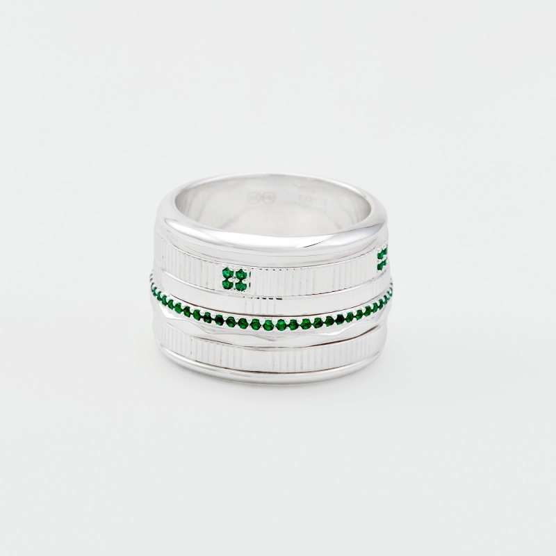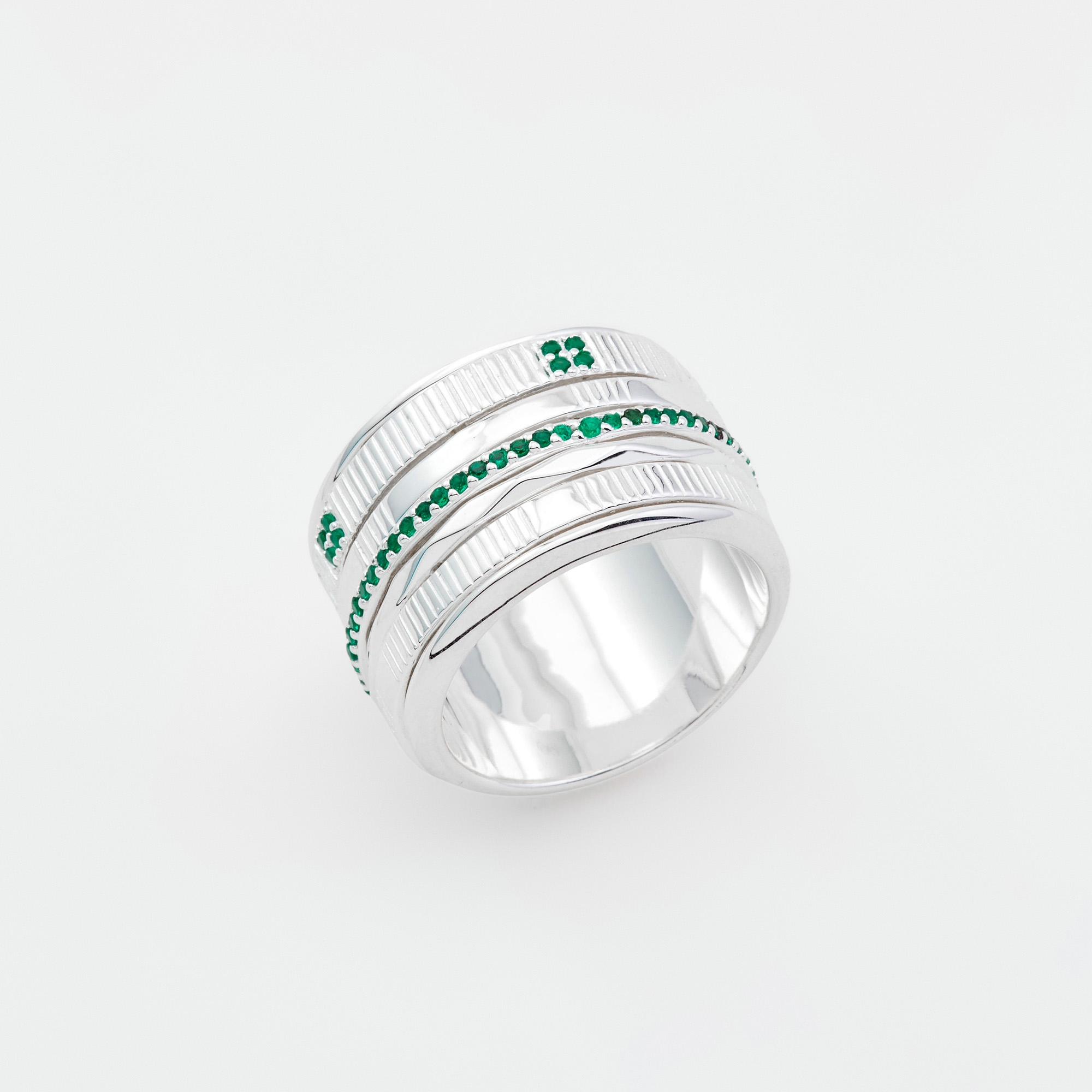 Bague en argent dite de prière composée d'un large anneau fixe et de 5 anneaux mouvants différemment travaillés et pour certains décorés d'émeraude verte de synthèse