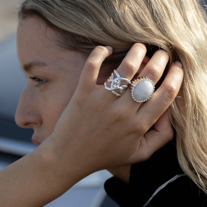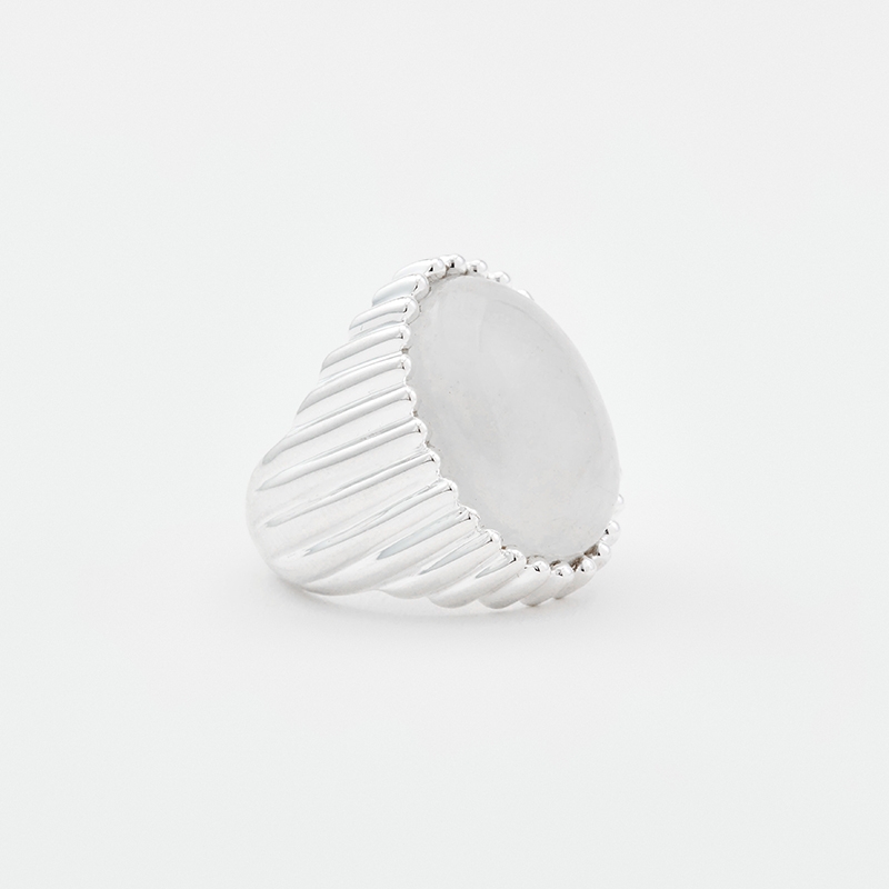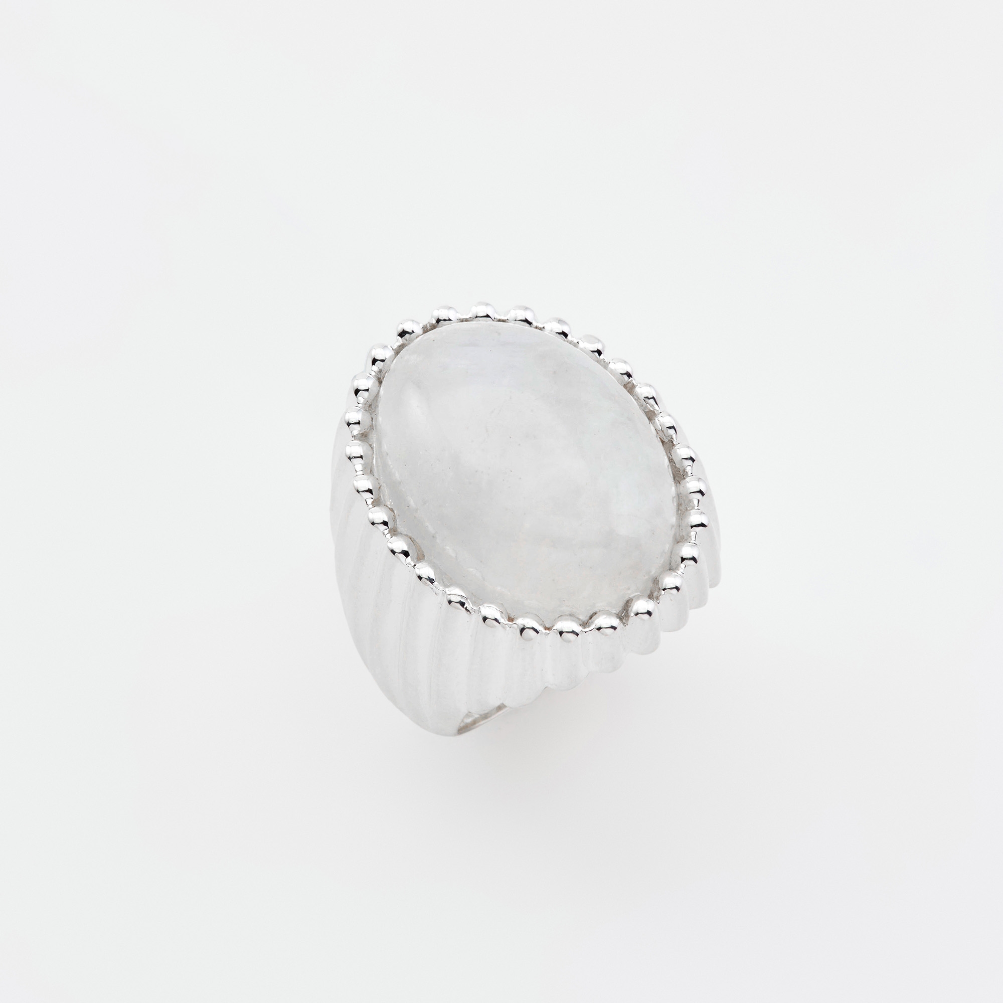 Bague en argent composée d'un grand ovale de pierre de lune serti de fin godrons se terminant par de micro boules