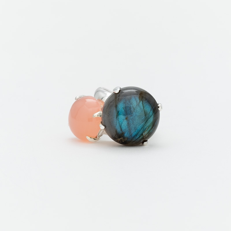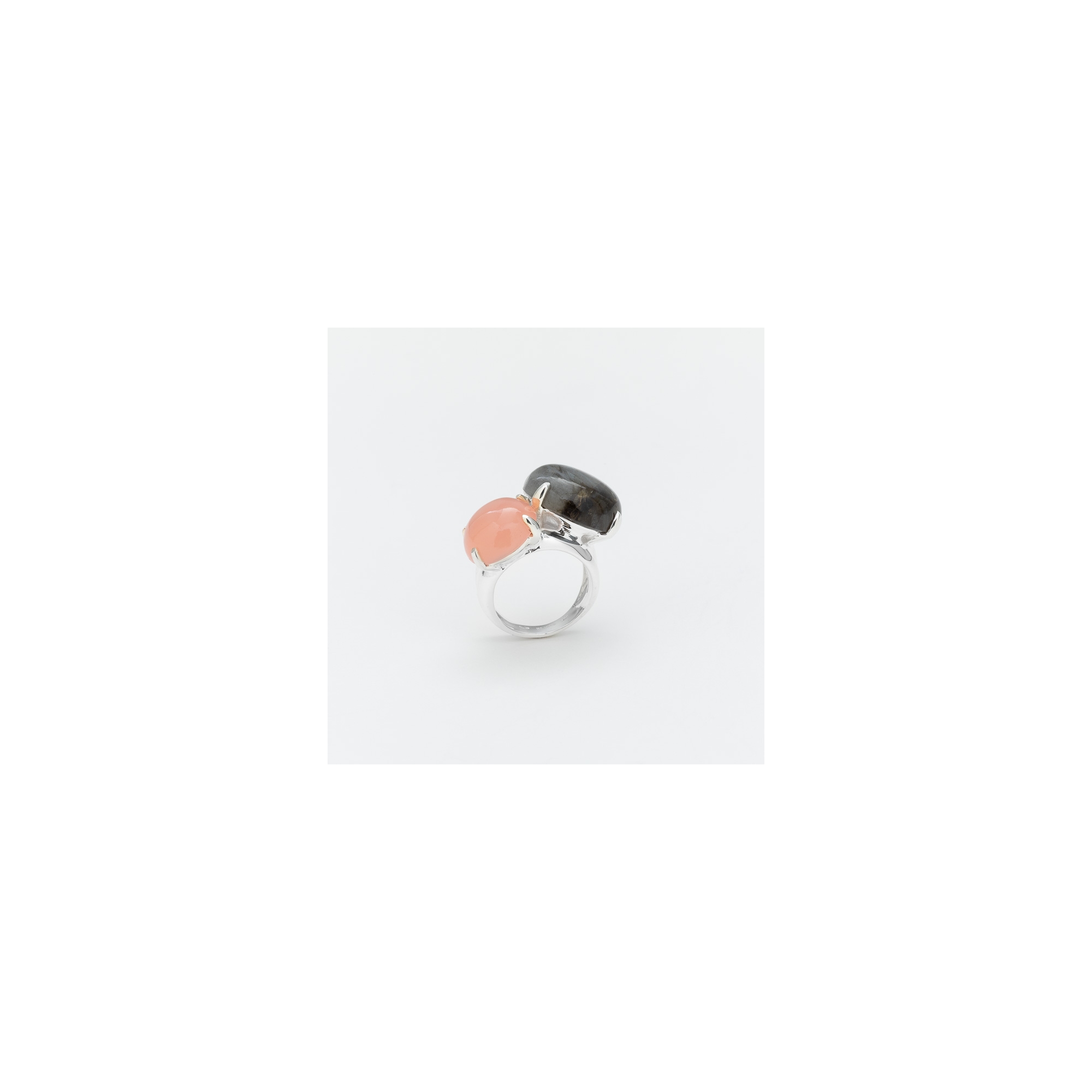 Bague en argent composée de 2 cabochons un de labradorite l'autre de calcédoine rose sertis de longues griffes fines