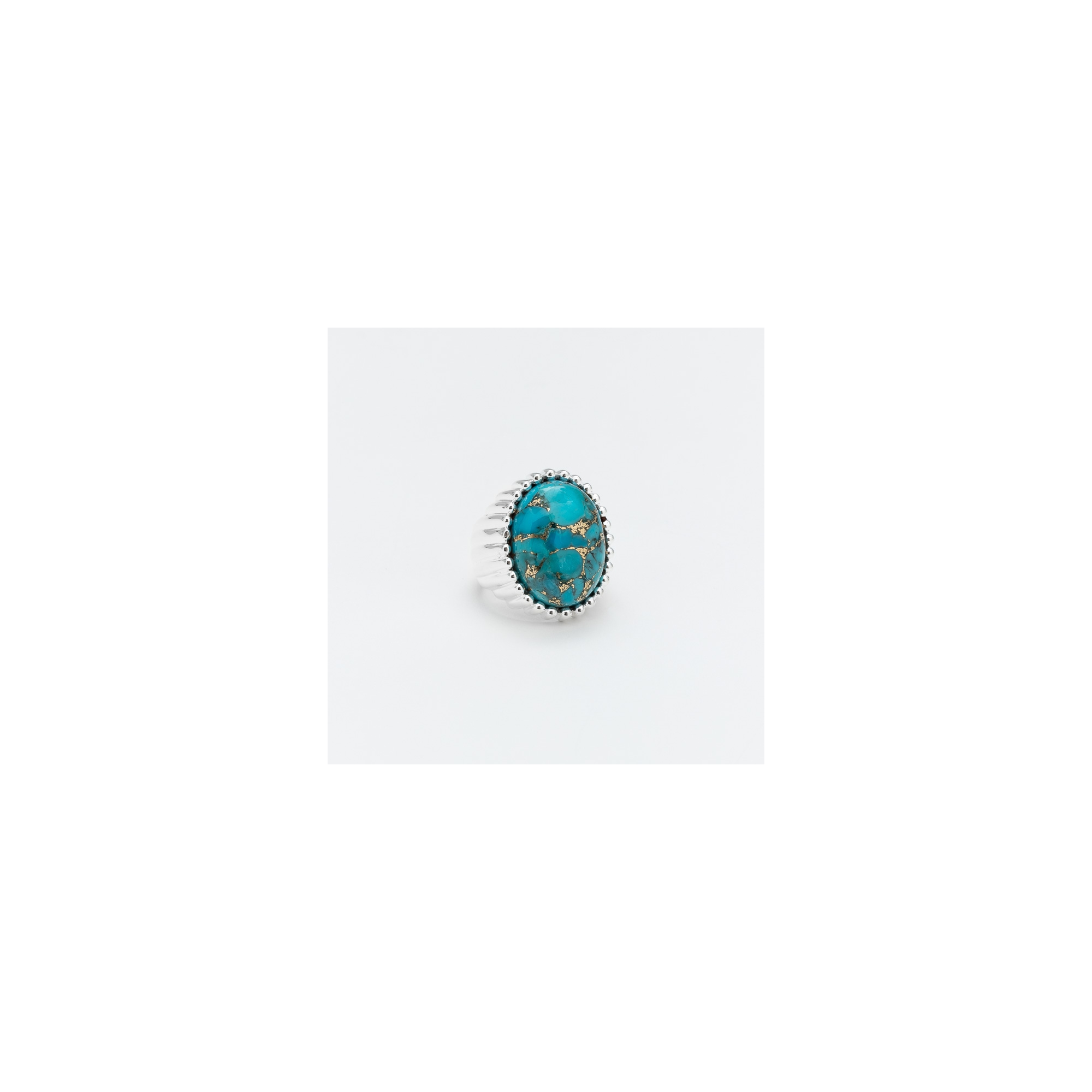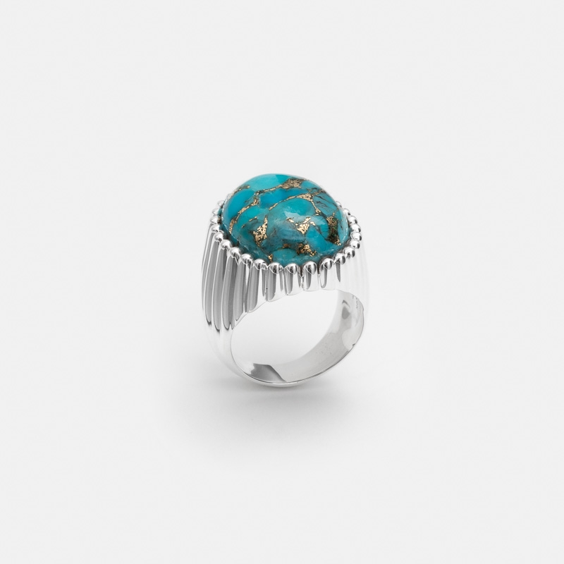 Bague en argent composée d'un grand ovale de copper turquoise serti de fin godrons se terminant par de micro boules