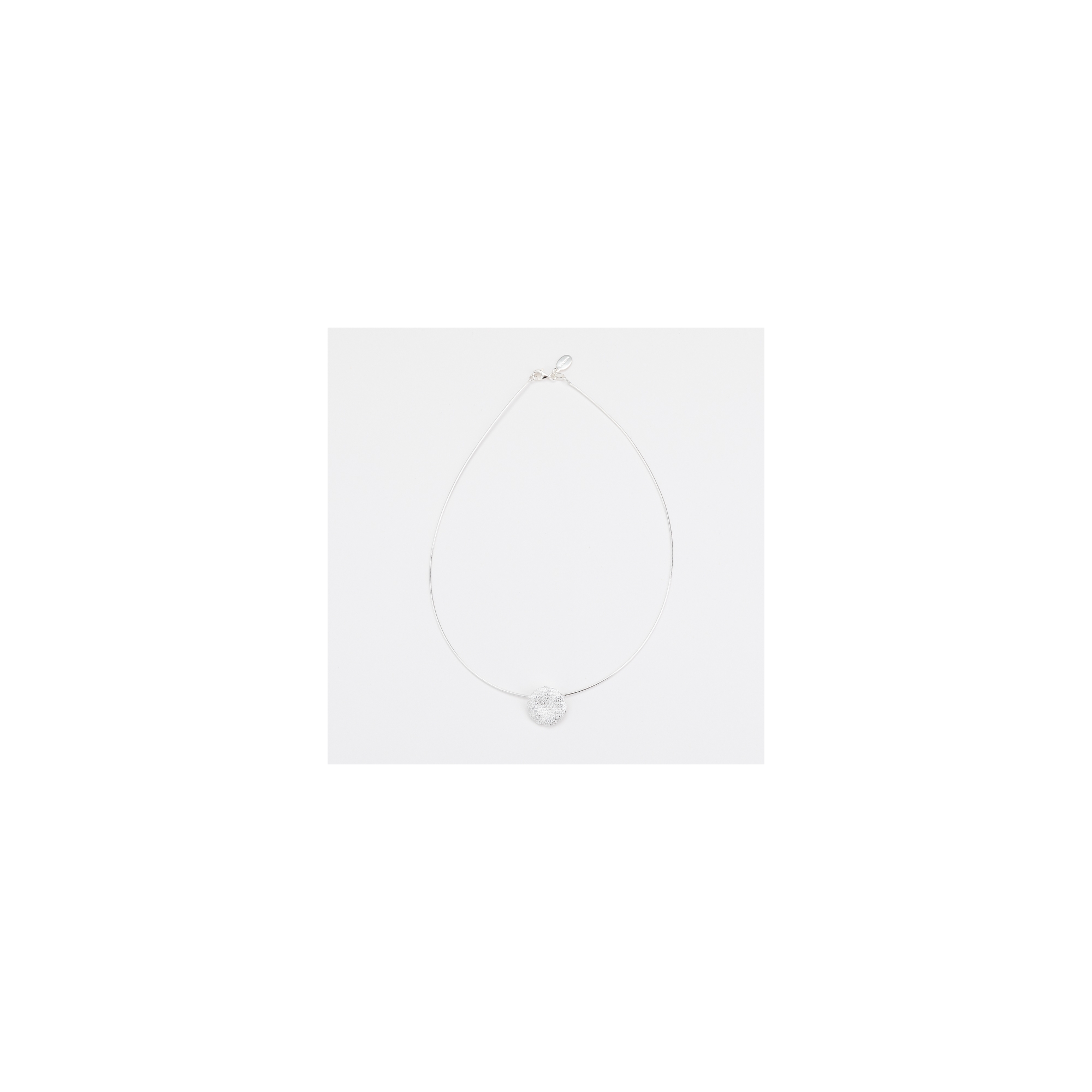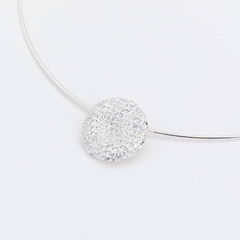 Collier en argent composé d'un cable et d'un pendentif rond ondulé et décoré d'oxydes blancs