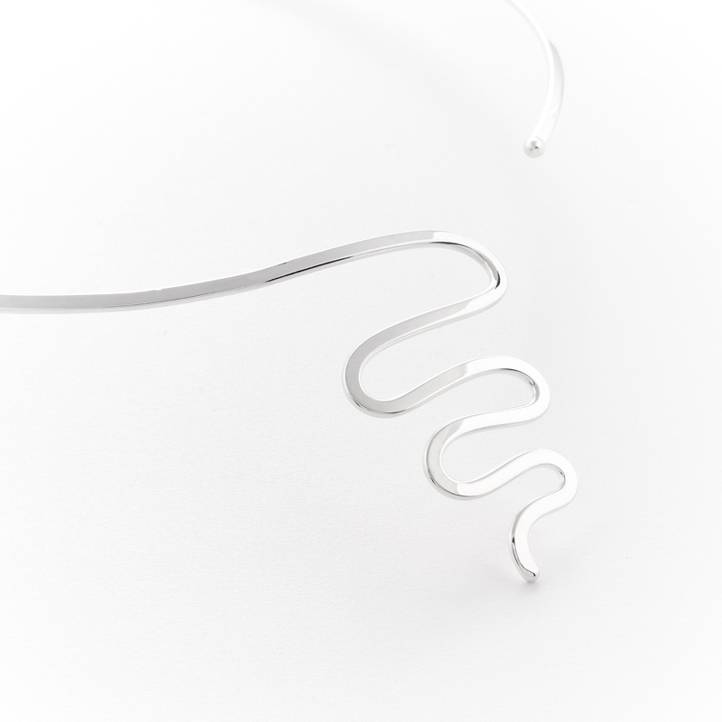 Collier en argent rigide ouvert devant et décoré d'une spirale.