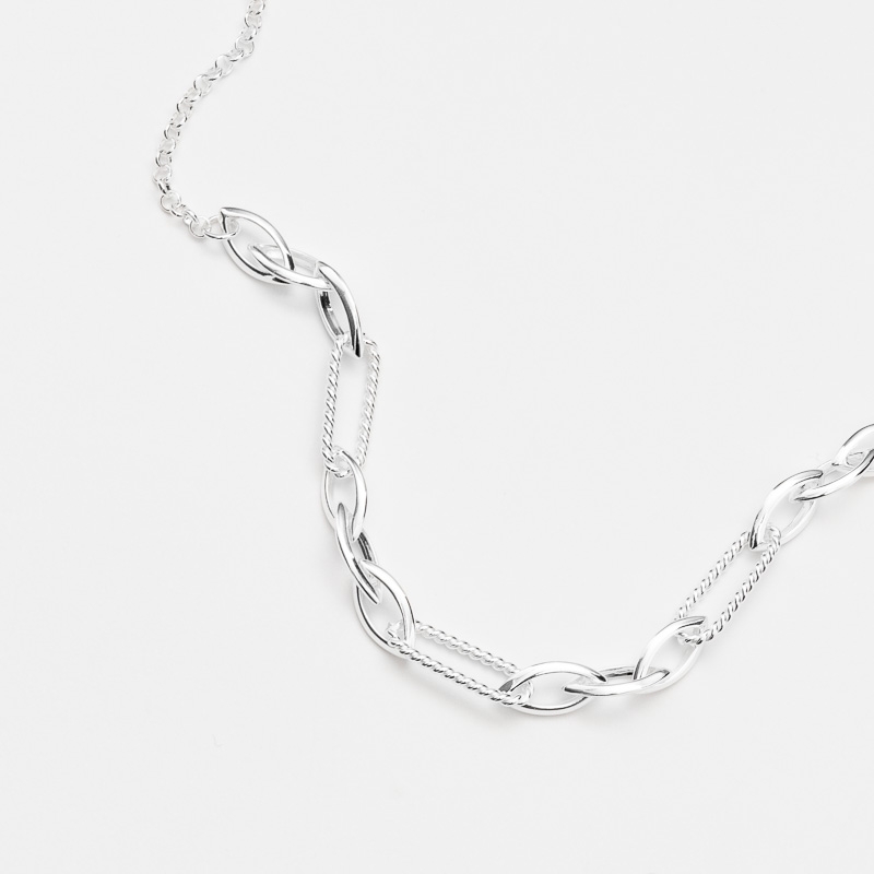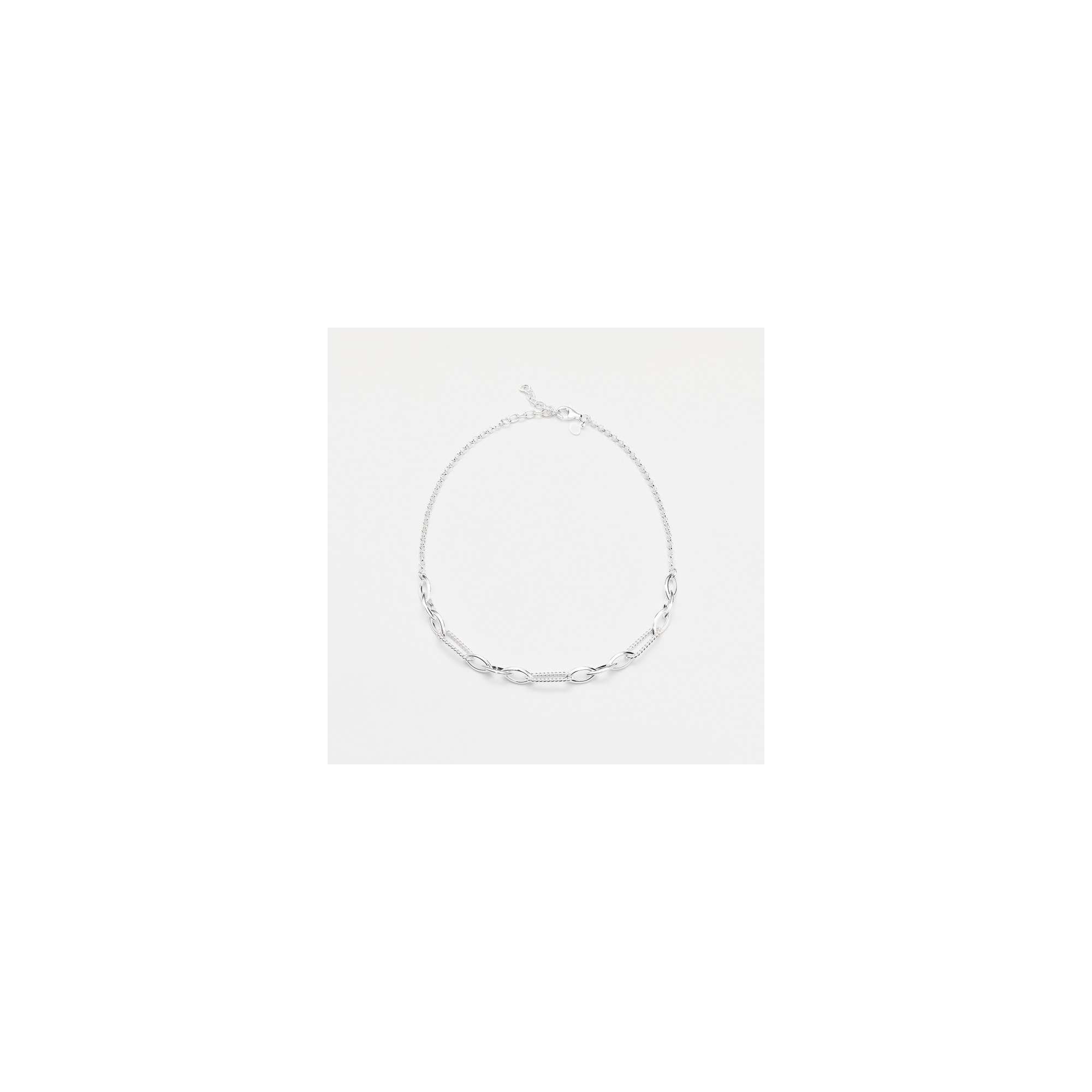 Collier argent composé d'une suite d'un long anneau torsadé et de 3 anneaux lisses pointus au centre et d'une petite chaine jaseron de chaque côté
