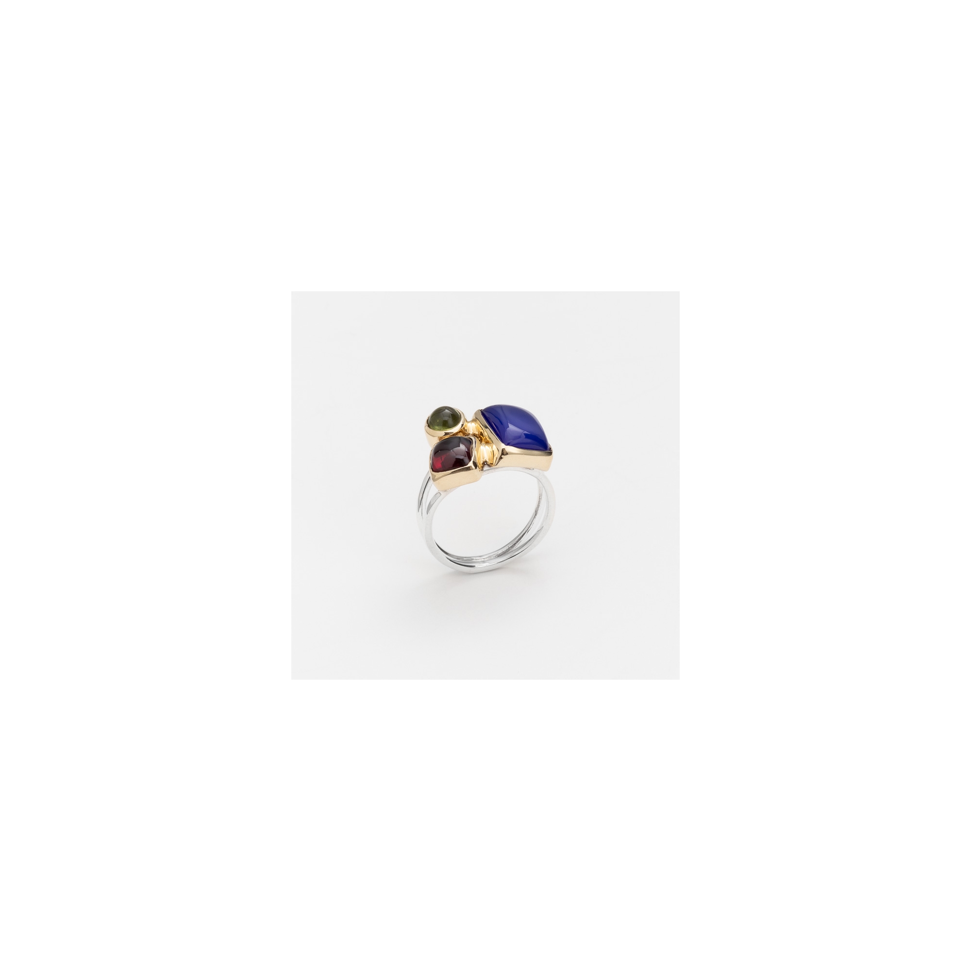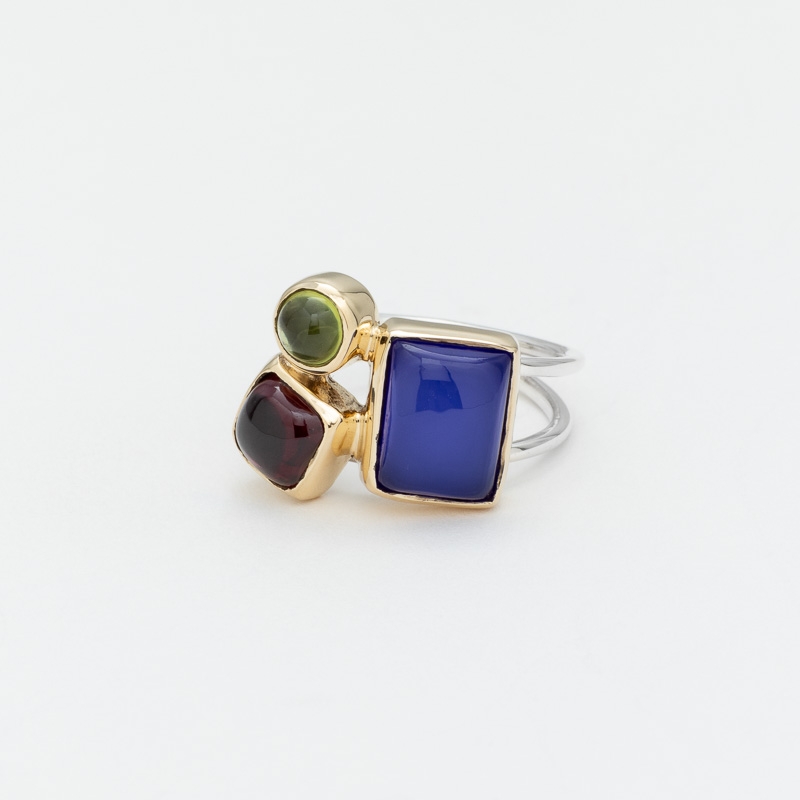Bague en argent et laiton décorée de 3 pierres (carré ou ronde) calcédoine bleu, péridot et grenat légèrement décalées
