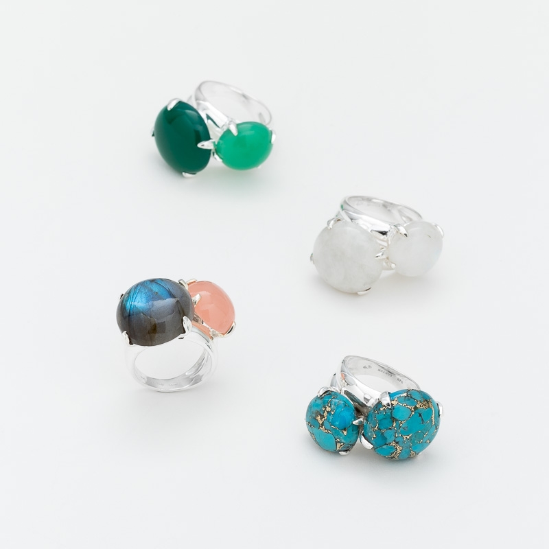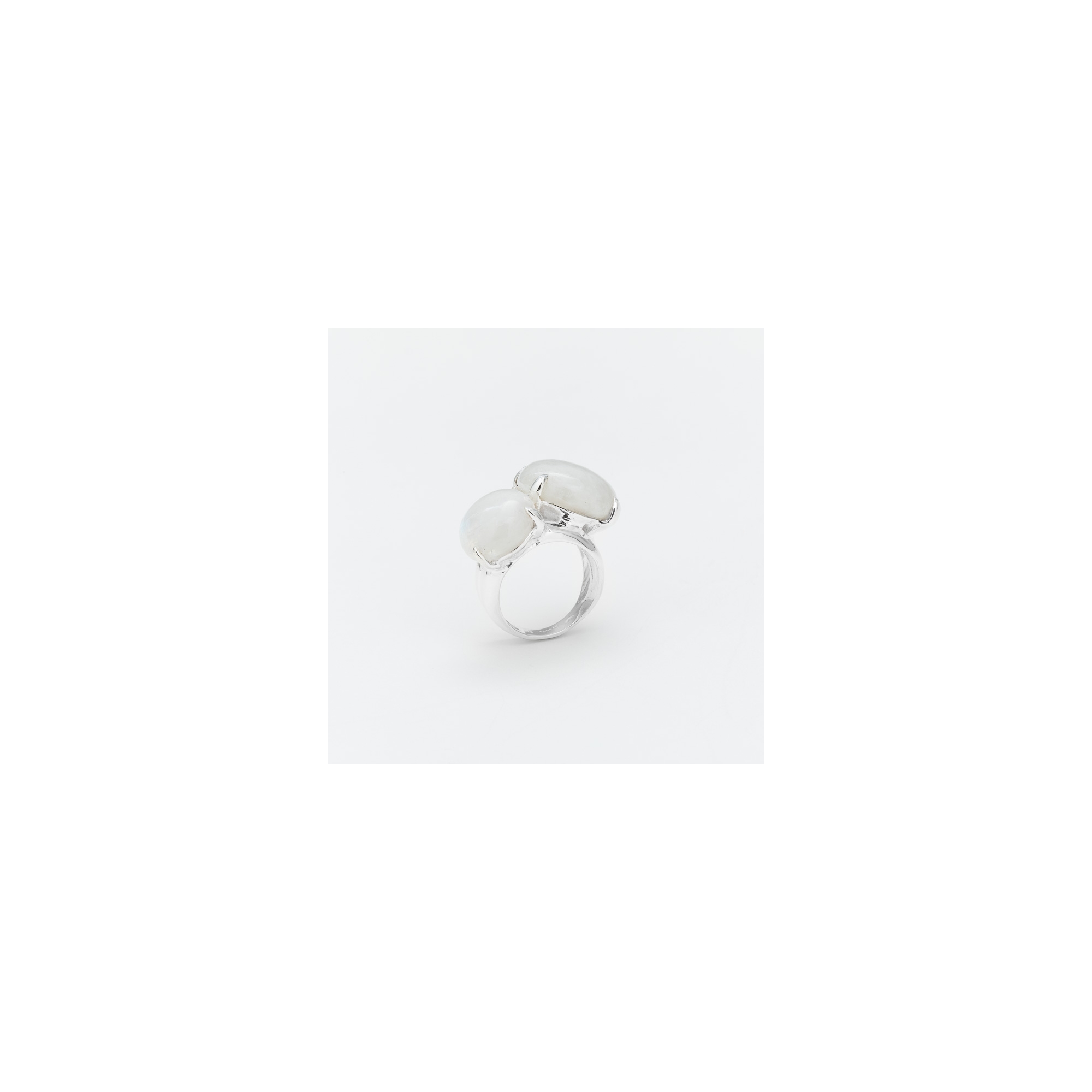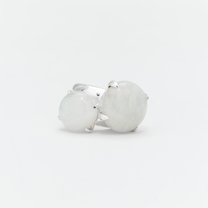 Bague en argent composée de 2 cabochons de pierre de lune sertis de longues griffes fines.