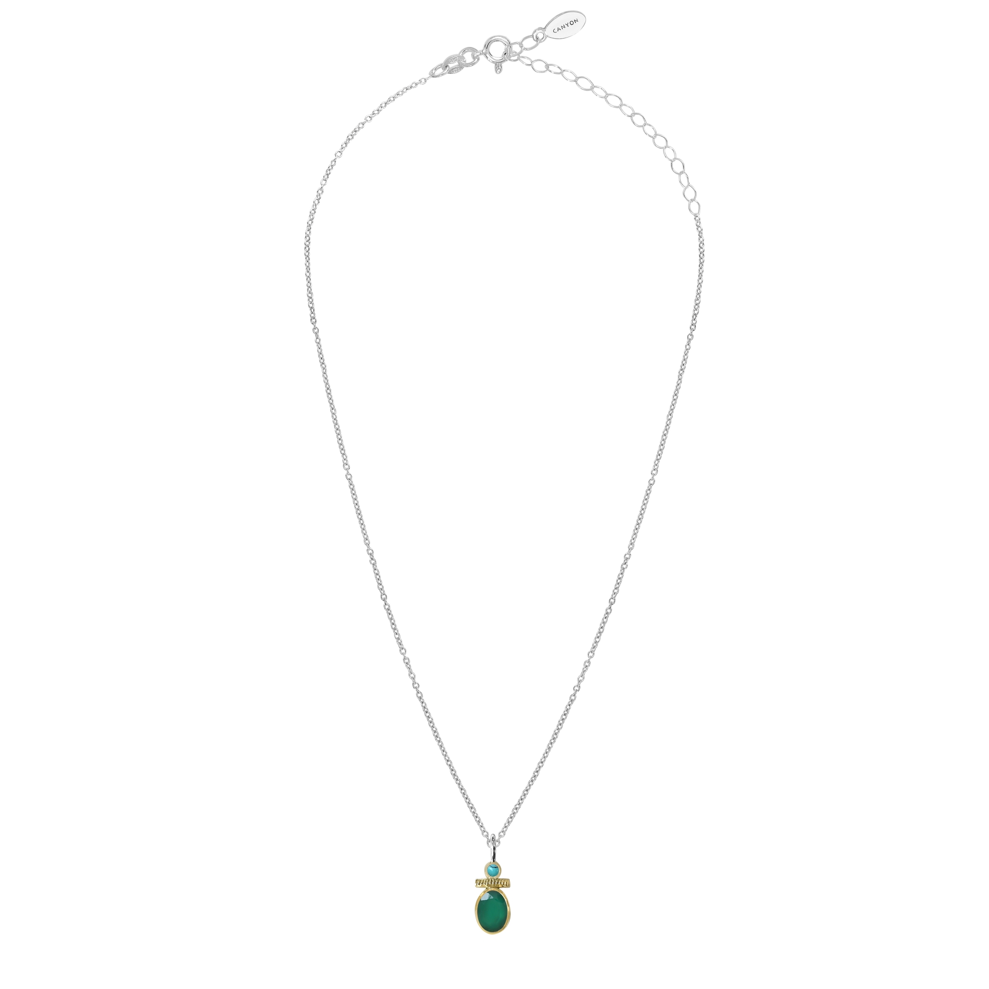Collier argent composé d'une chainette et d'un pendentif argent et laiton orné d'un onyx vert et d'une turquoise reconstituée.