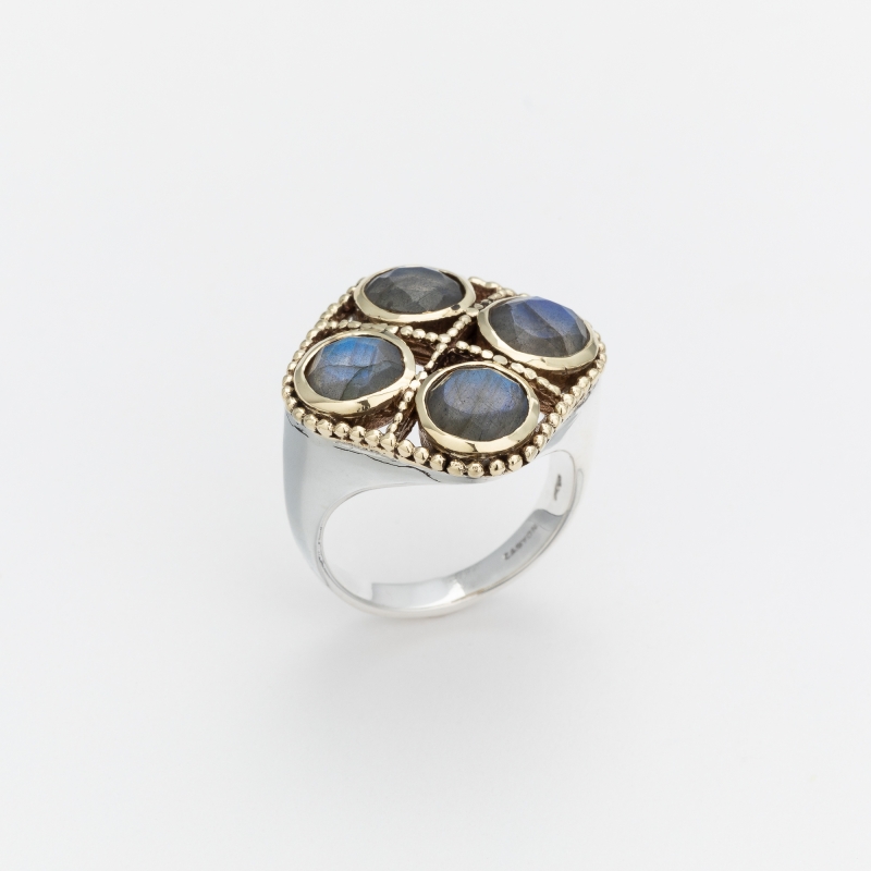 Bague en argent carré décorée de 4 labradorites rondes serties de laiton sur un anneau argent.