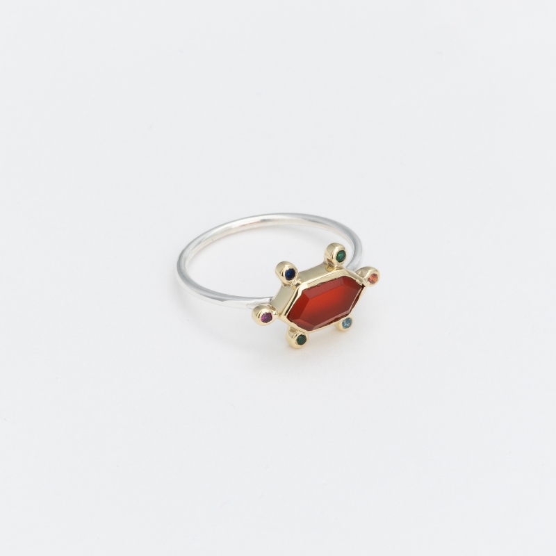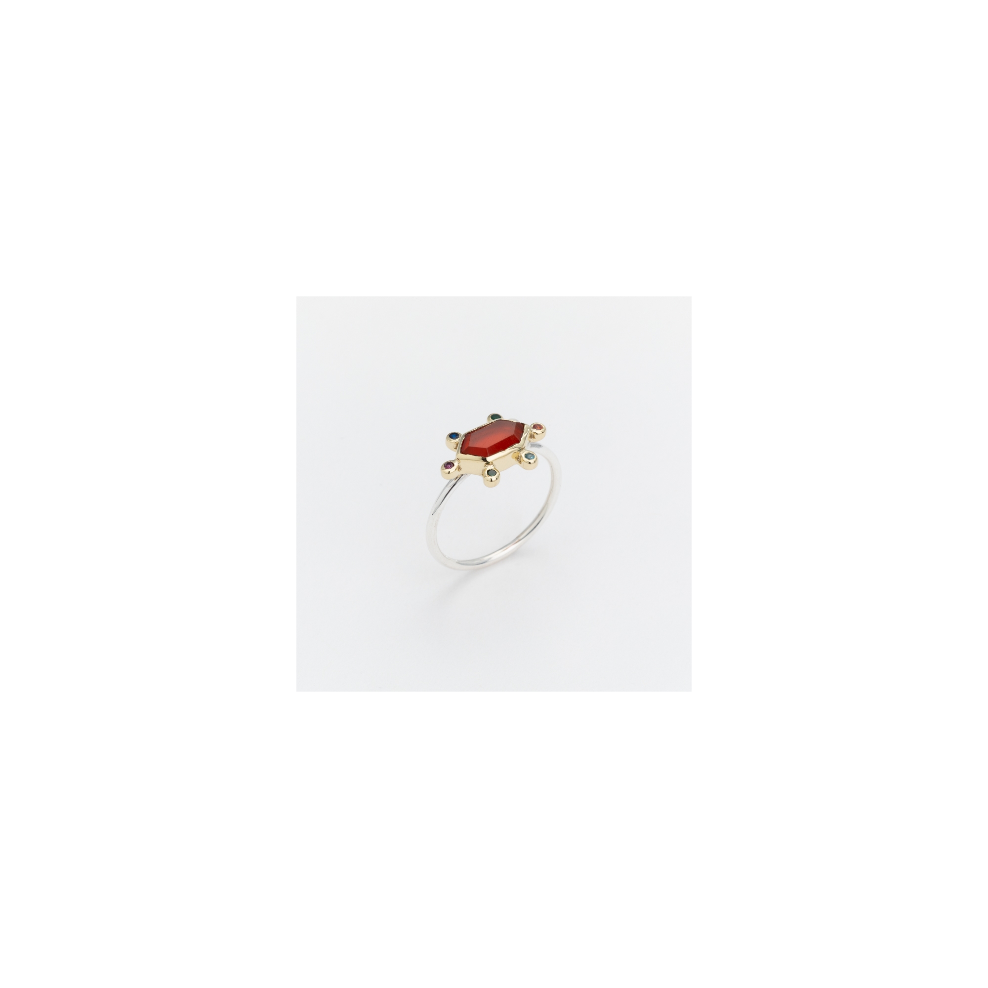 Bague bicolore formée d'un hexagone de laiton avec en son centre un cabochon de cornaline décoré de micro oxydes multicolores et d'un fin anneau argent .