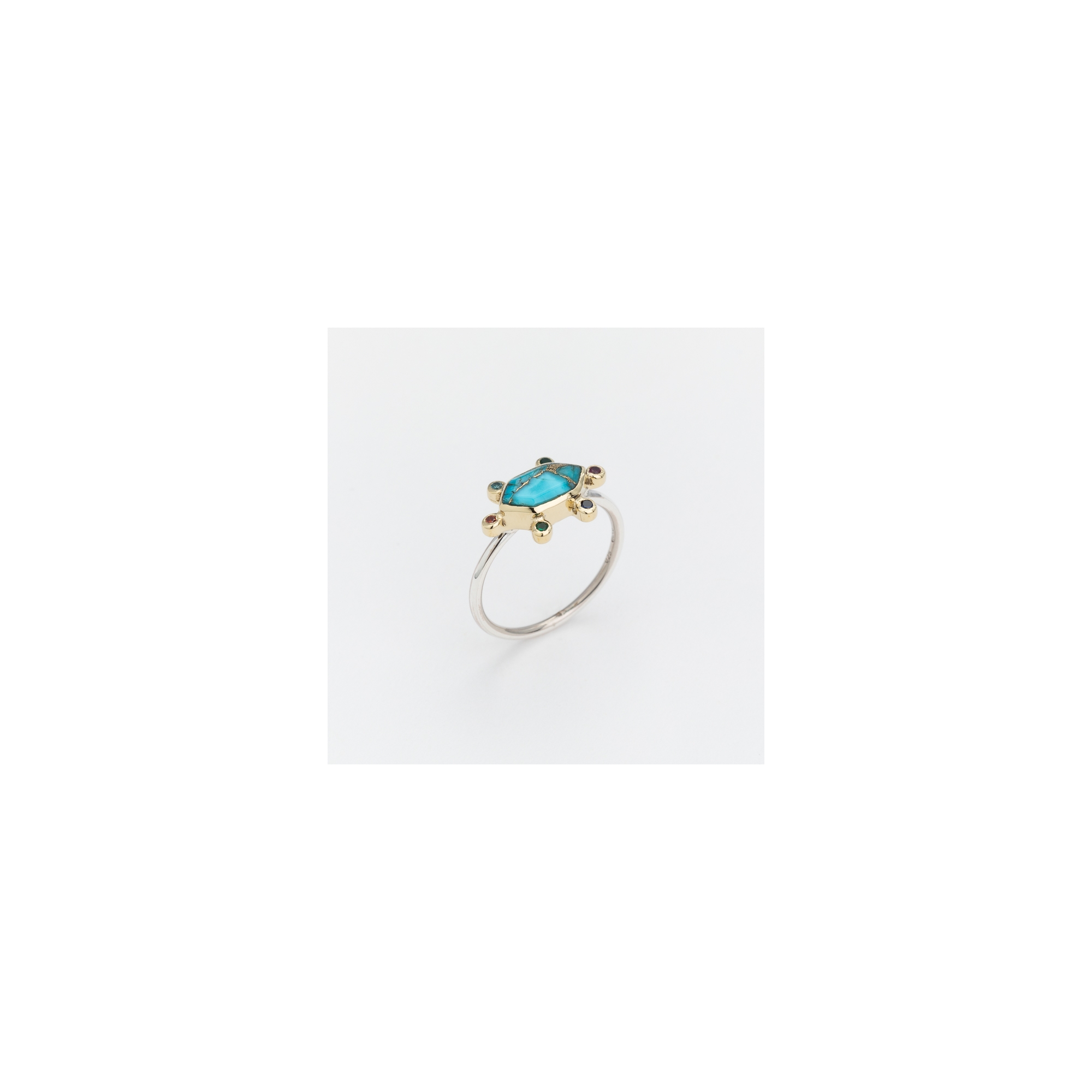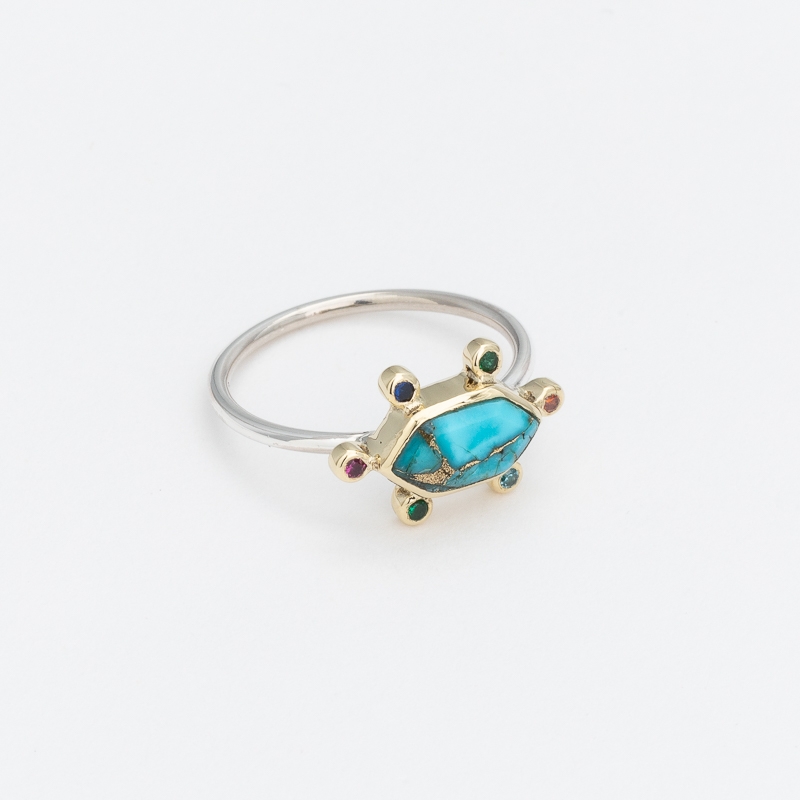 Bague bicolore formée d'un hexagone de laiton avec en son centre un cabochon de turquoise copper décoré de micro oxydes multicolores et d'un fin anneau argent.