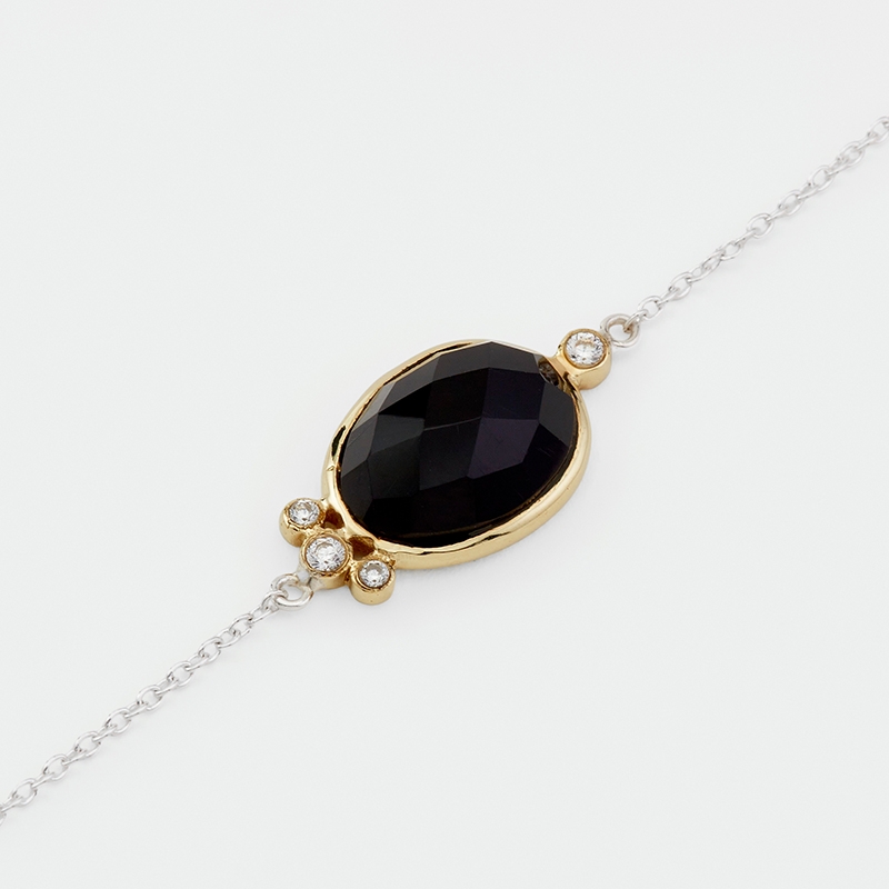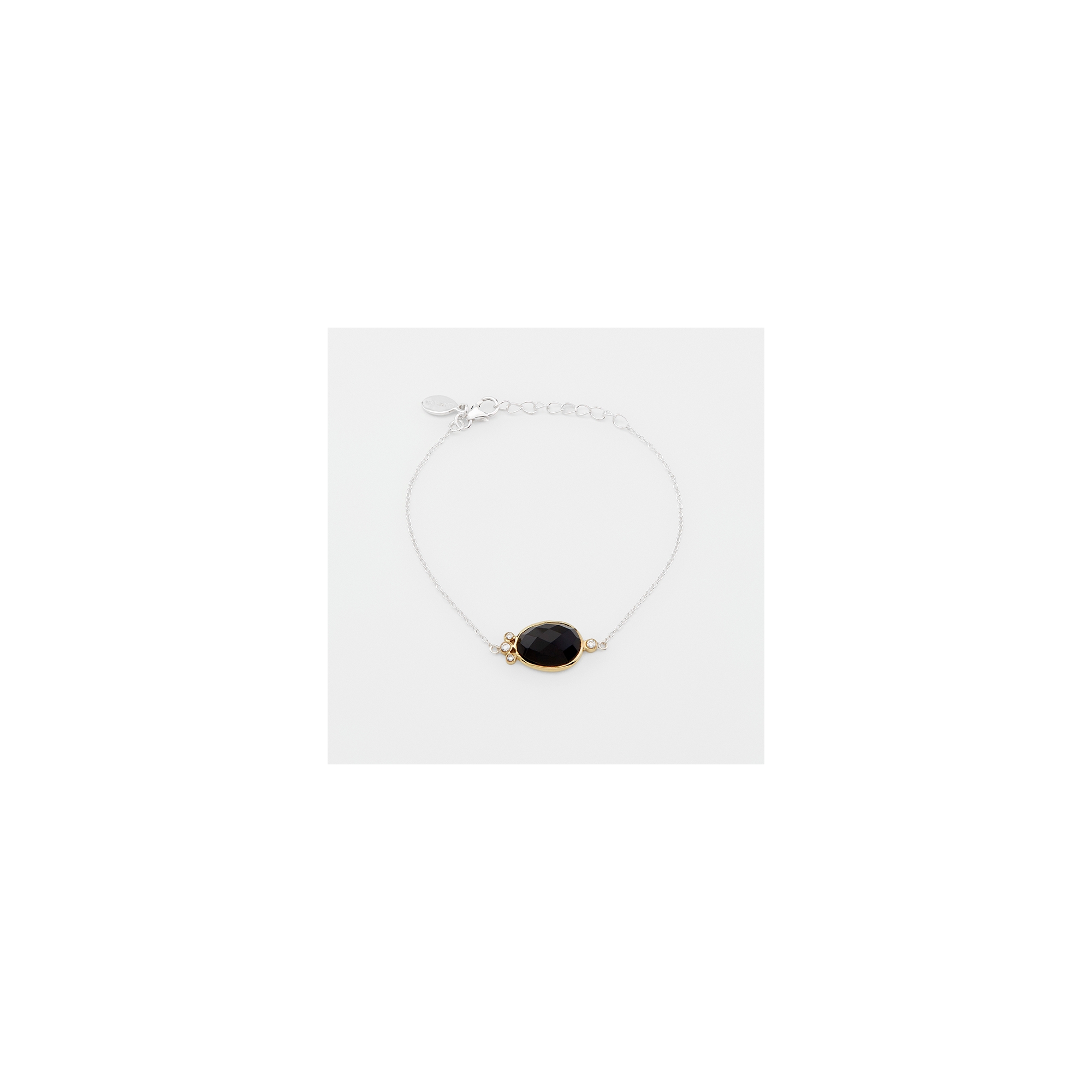Bracelet en argent et laiton composé d'une chainette et d'un ovale en onyx noir décoré de 4 oxydes blancs.