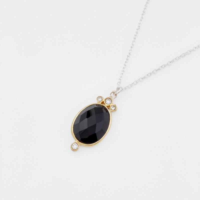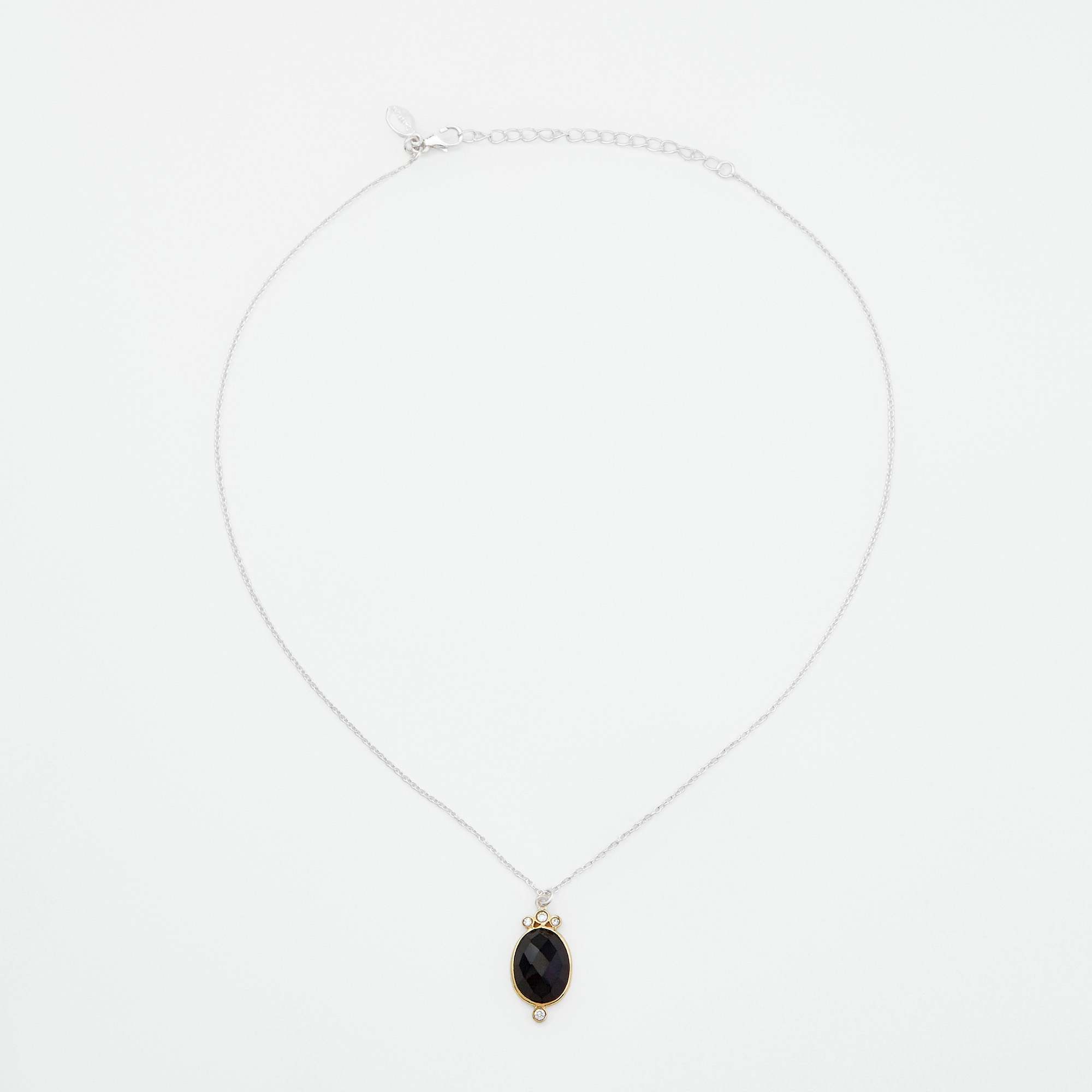 Collier en argent et laiton composé d'une chainette en argent et d'un pendentif en onyx noir décoré de 4 oxydes blancs.