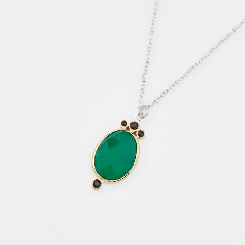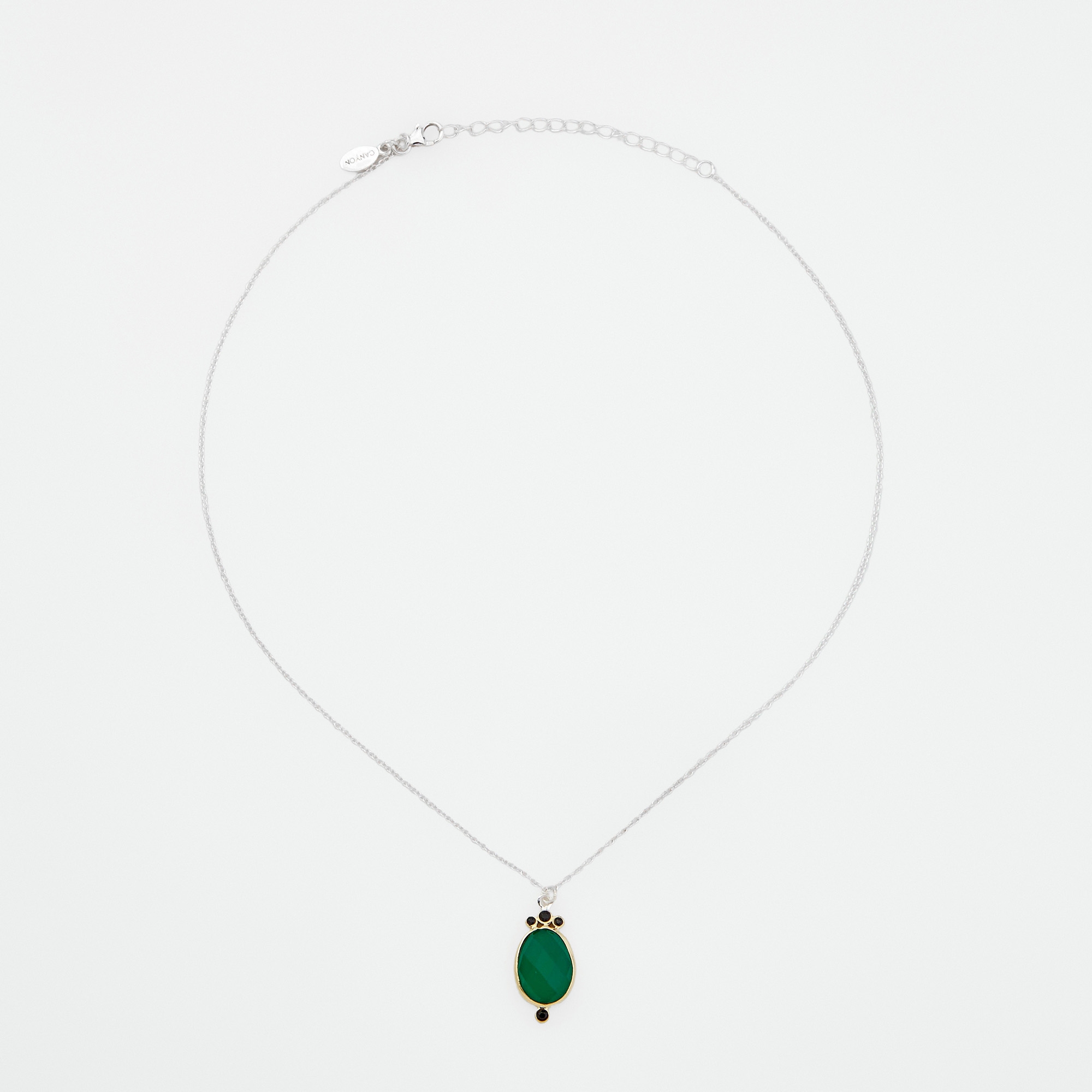 Collier en argent et laiton composé d'une chainette en argent et d'un pendentif en onyx vert décoré de 4 oxydes noirs.