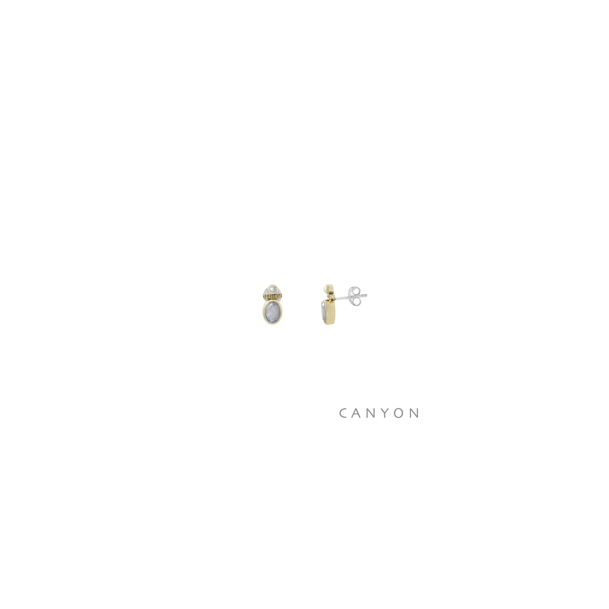 Boucles d'oreille puces argent et laiton ornées d'une petite pierre de lune et d'une petite perle synthétique.Longueur : 1,2 cm