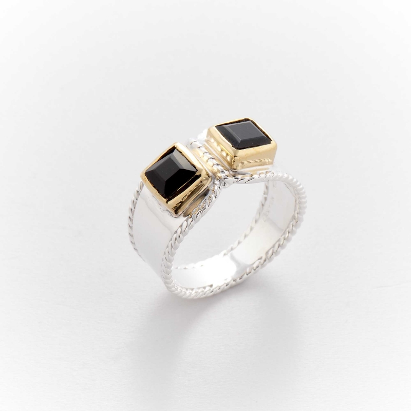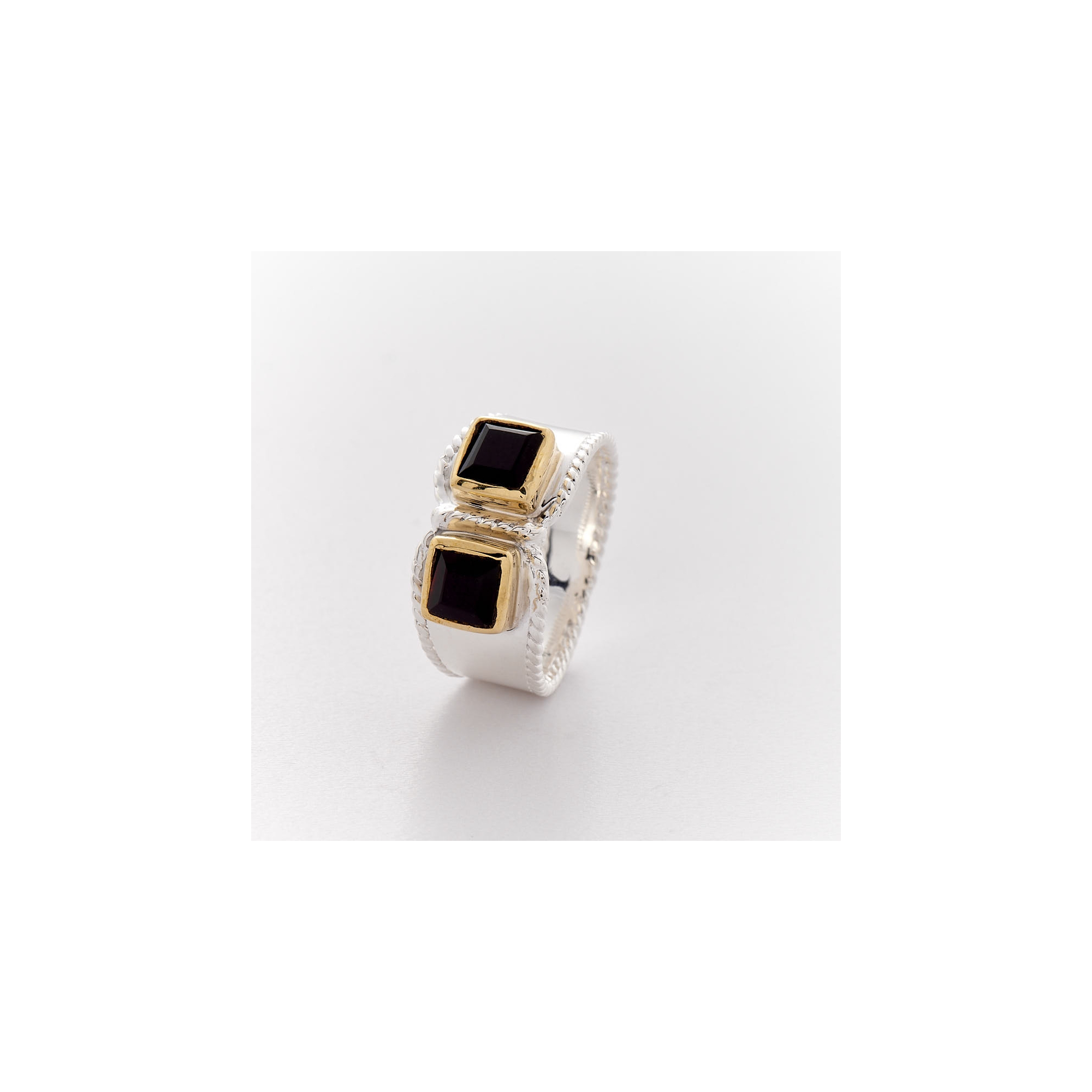 Bague en argent ronde décorée de 4 labradorites rondes serties de laiton sur un anneau argent.
