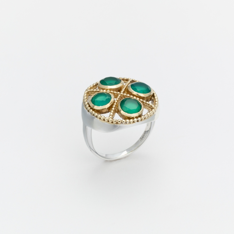 Bague en argent ronde décorée de 4 onyx verts ronds serties de laiton sur un anneau argent.