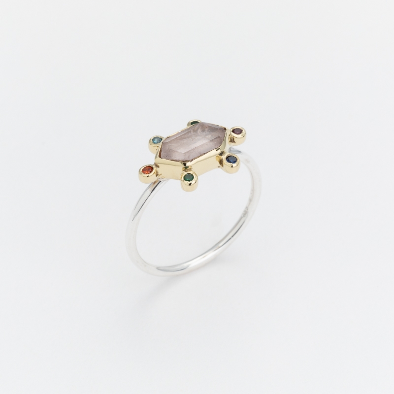 Bague bicolore formée d'un hexagone de laiton avec en son centre un cabochon de quartz rose décoré de micro oxydes multicolores et d'un fin anneau argent.