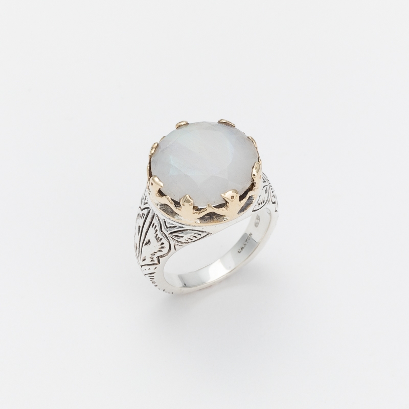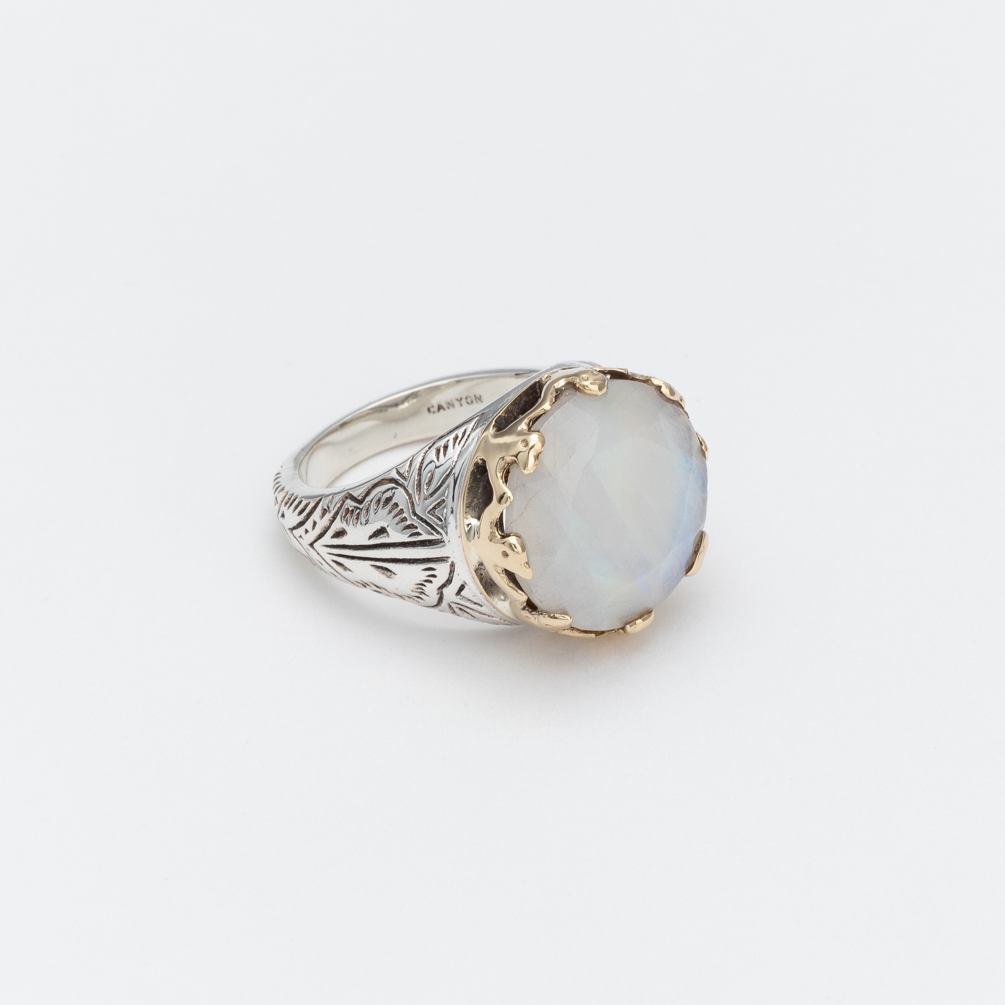 Bague bicolore décorée d'une pierre de lune ronde sertie de petits oiseaux en laiton sur un anneau argent gravé et vieilli.