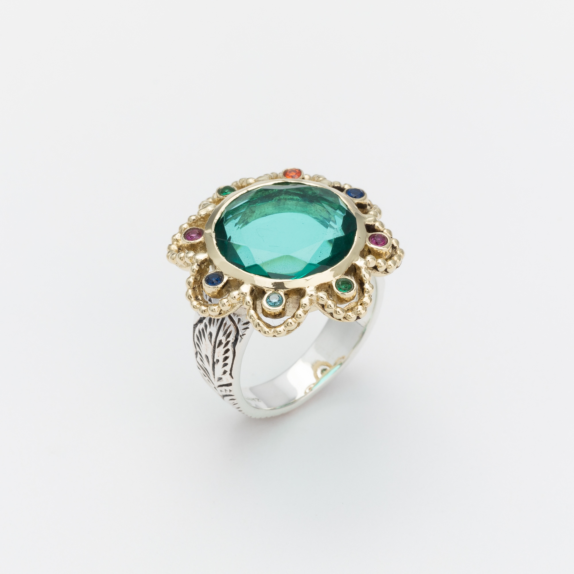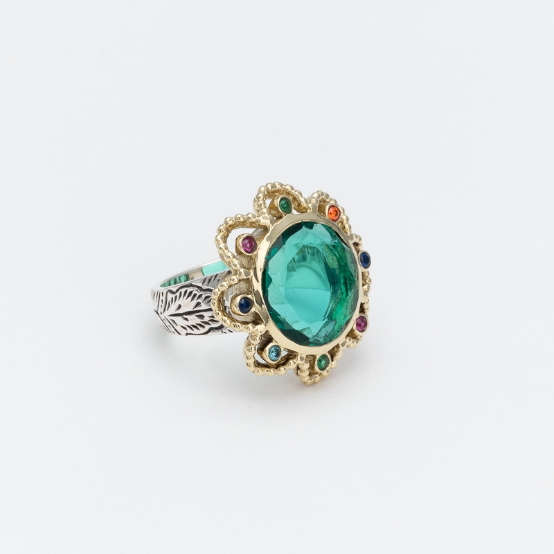 Bague bicolore décorée d'un verre couleur apatite rond serti de laiton entourée de petits arcs de microboules en laiton et de microoxydes sertis de laiton sur un anneau argent.