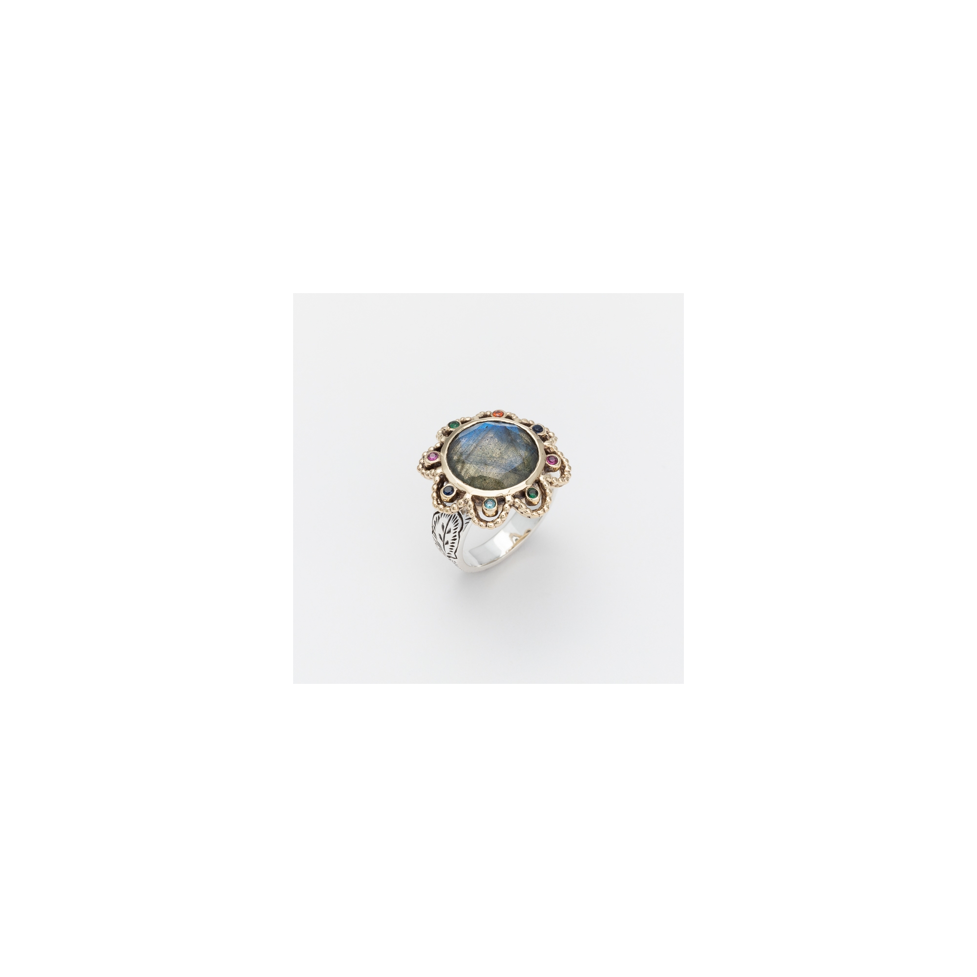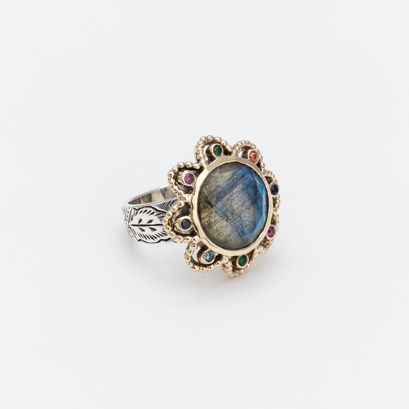 Bague bicolore décorée d'une labradorite ronde sertie de laiton entourée de petits arcs de microboules en laiton et de micropierres serties de laiton sur un anneau argent.