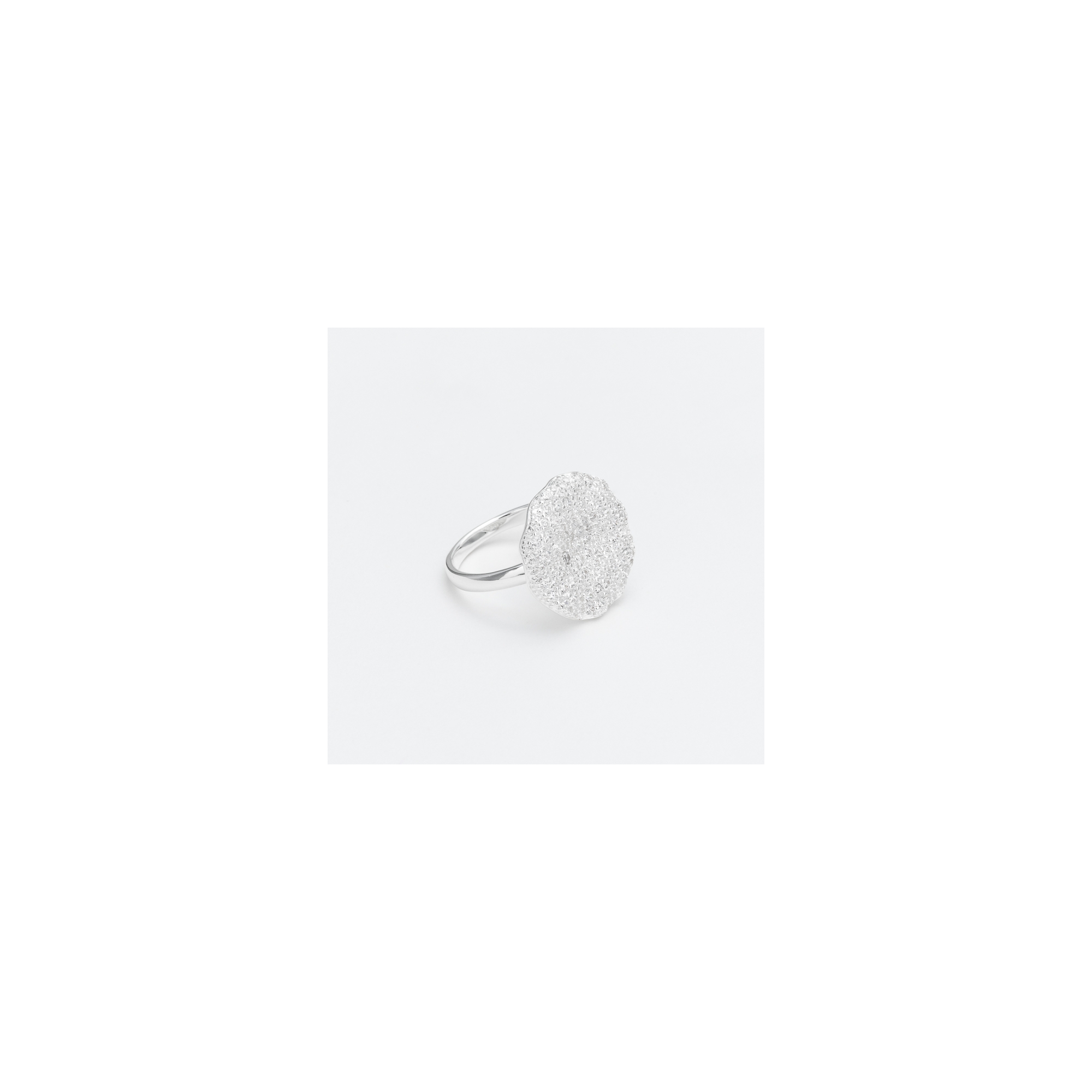 Bague Argent composée d'un anneau fin et d'une plaque ronde légèrement ondulée et décorée d'oxydes blancs.