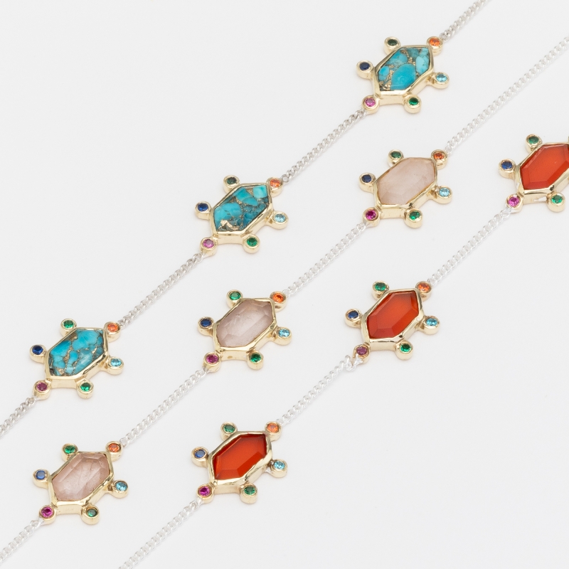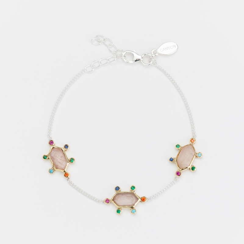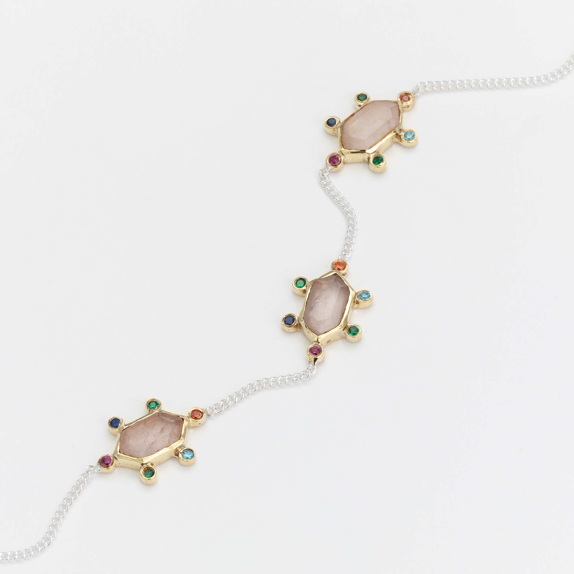 Bracelet bicolore formé d'une chainette et de 3 hexagones de laiton avec en leur centre un cabochon de quartz rose décoré de micro oxydes multicolores.