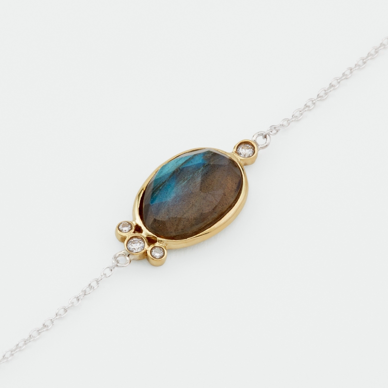 Bracelet en argent et laiton composé d'une chainette et d'un ovale en labradorite décoré de 4 oxydes blancs.