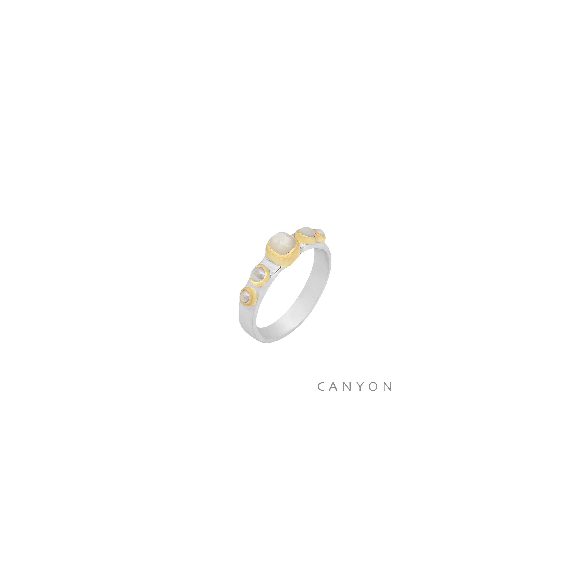 Bague en argent formé d'un petit anneau décoré par de la nacre et des perles serti de laiton