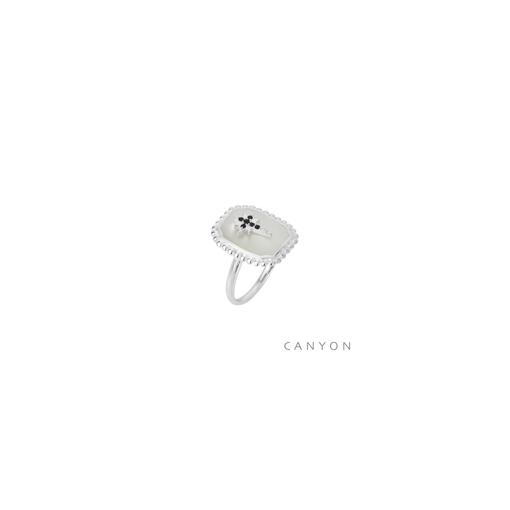 Bague argent constituée d'une nacre rectangle blanche décorée d'une étoile filante noire
