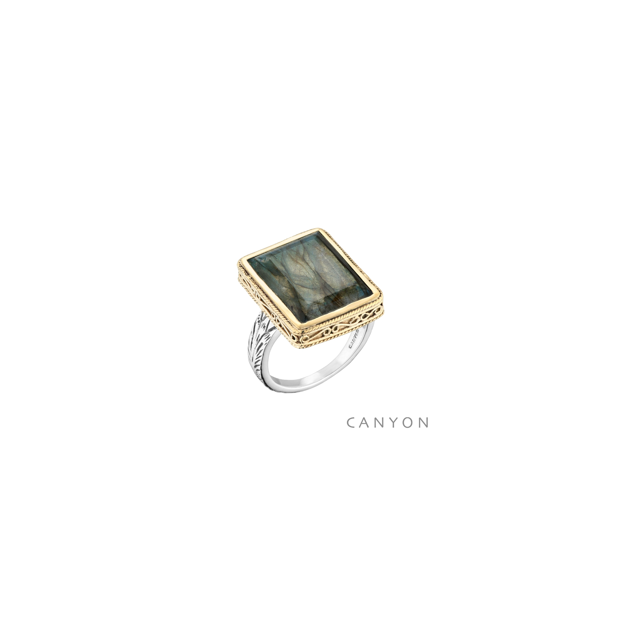 Bague argent et laiton composée d'un anneau argent gravé et d'un grand rectangle de labradorite sertis de laiton ajouré