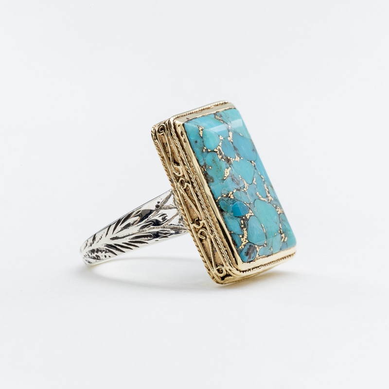 Bague argent et laiton composée d'un anneau argent gravé et d'un grand rectangle de turquoise copper reconstituée serti de laiton ajouré