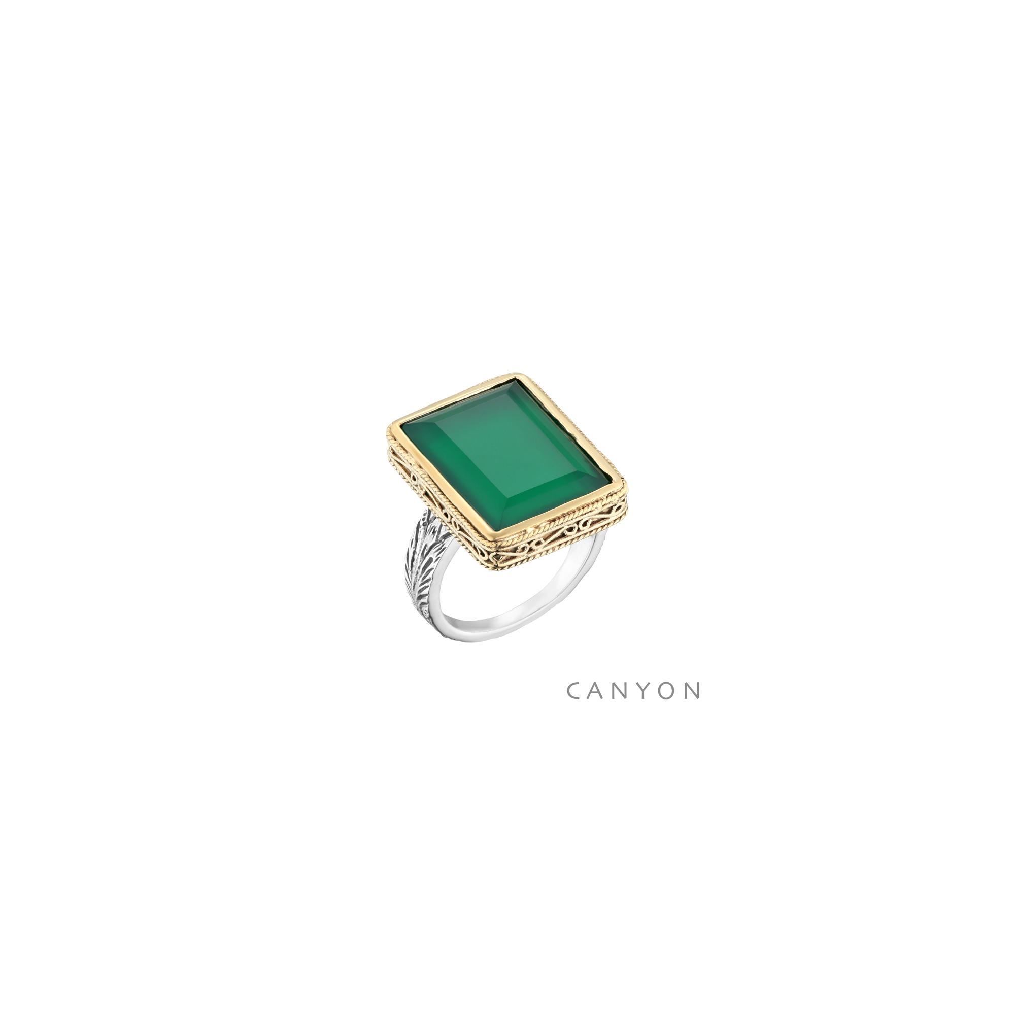 Bague argent et laiton composée d'un anneau argent gravé et d'un grand rectangle d'onyx vert sertis de laiton ajouré