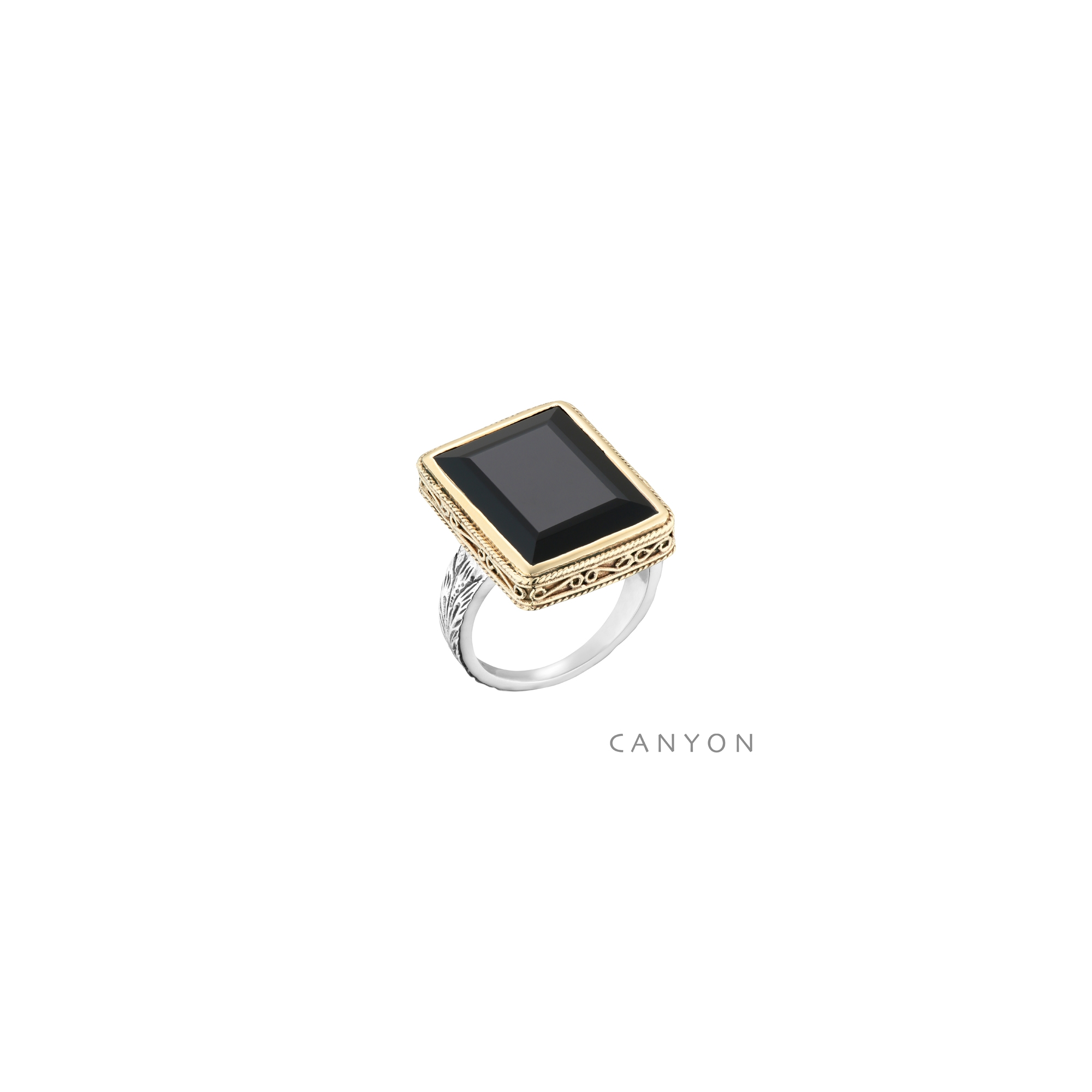 Bague argent et laiton composée d'un anneau argent gravé et d'un grand rectangle d'onyx noir sertis de laiton ajouré