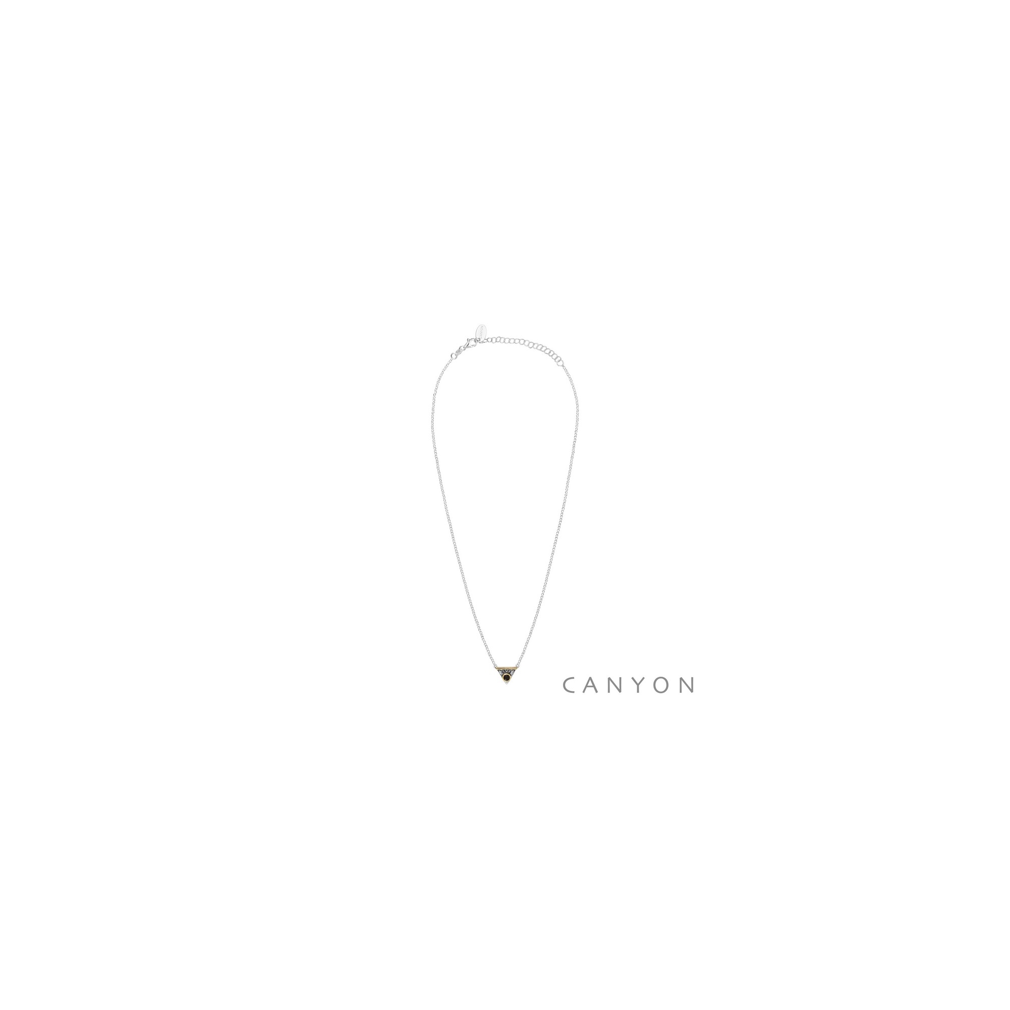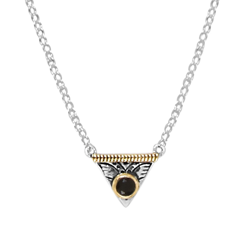 Collier argent constitué d'un triangle gravé orné d'un onyx noir rond cerclé de laiton et d'un tube strié en laiton au centre d'une chainette