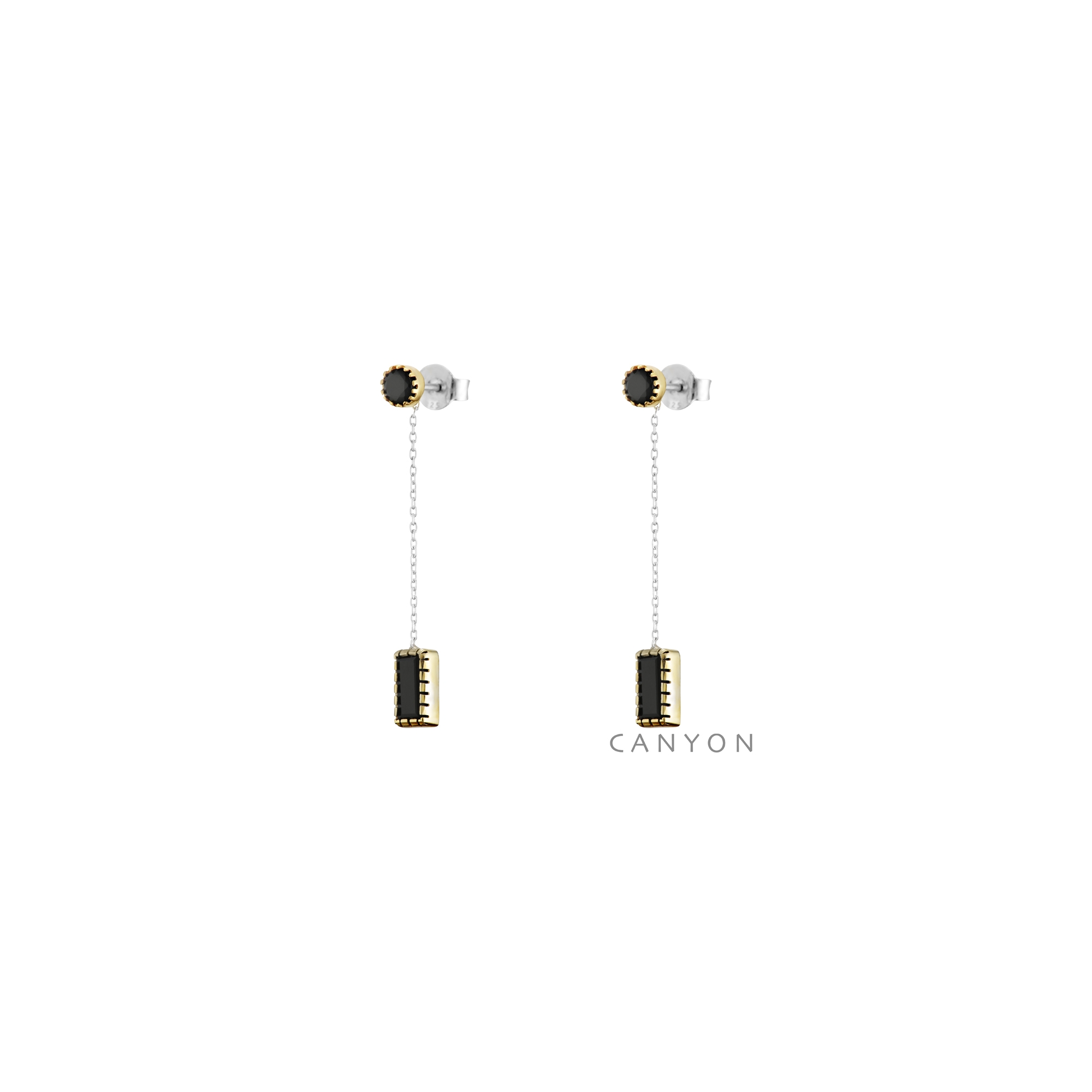 Boucles d'oreille pendantes en argent et laiton constituées d'une puce ronde en onyx noir et d'une chainette ayant à son bout un onyx noir rectangulaire