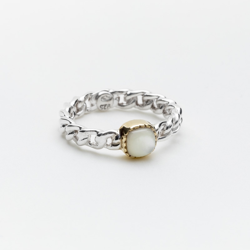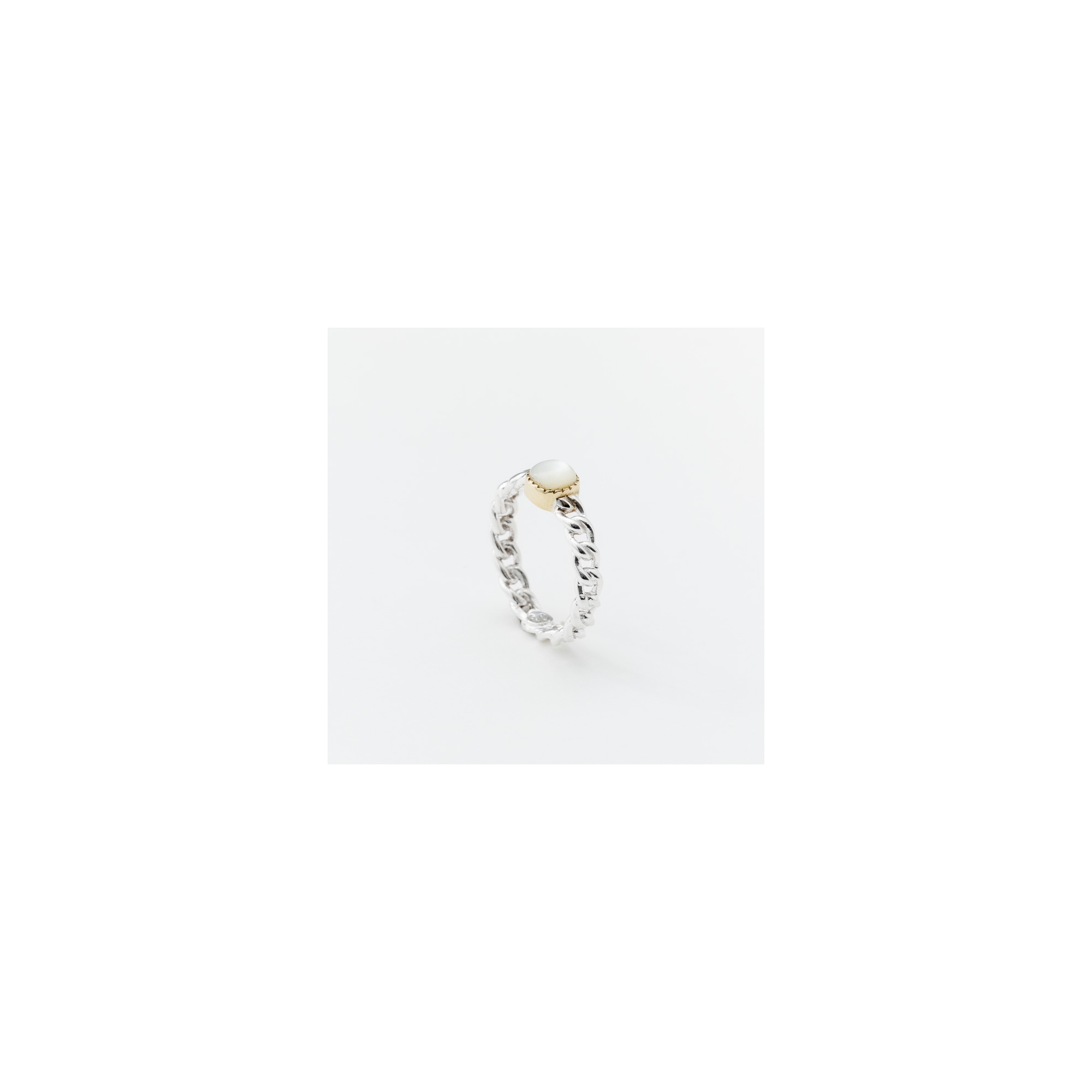 Bague anneau en argent en forme de petite chaine décoré d'un carré de nacre blanche serti de laiton